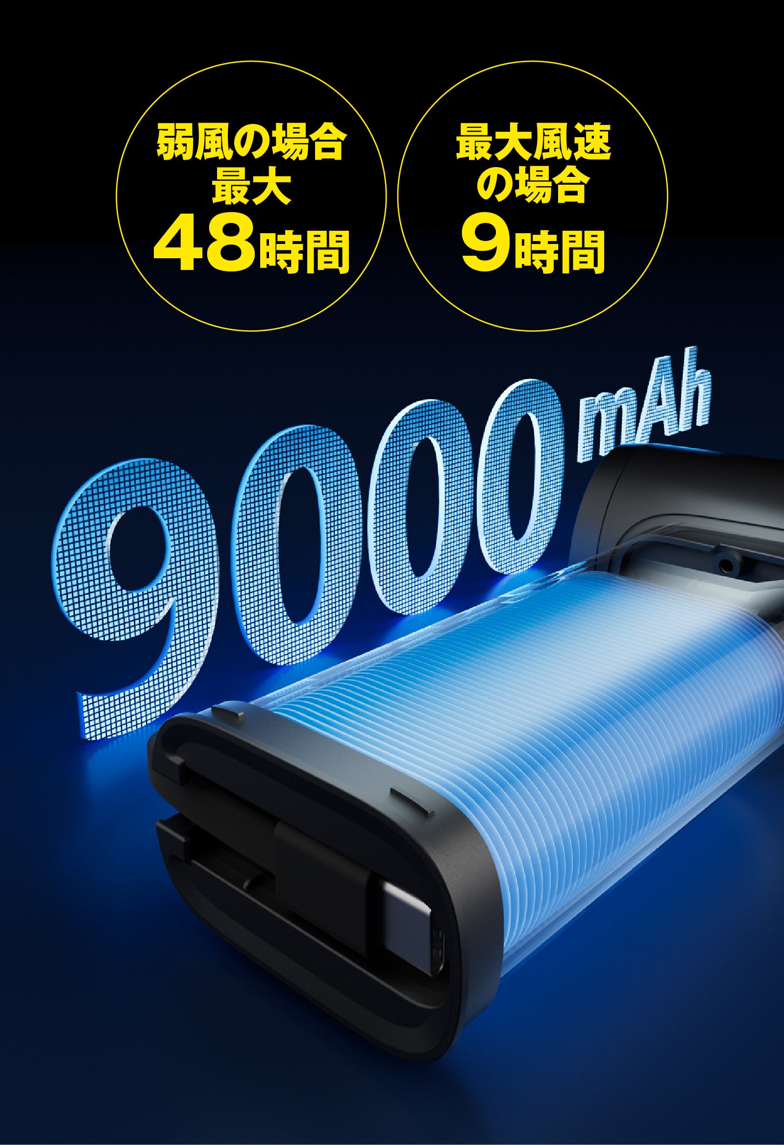 【ChargeFan Pro】は9000mAhの大容量バッテリーを搭載し、弱風での使用なら最大48時間、最大風速でも9時間も連続使用が可能です。
