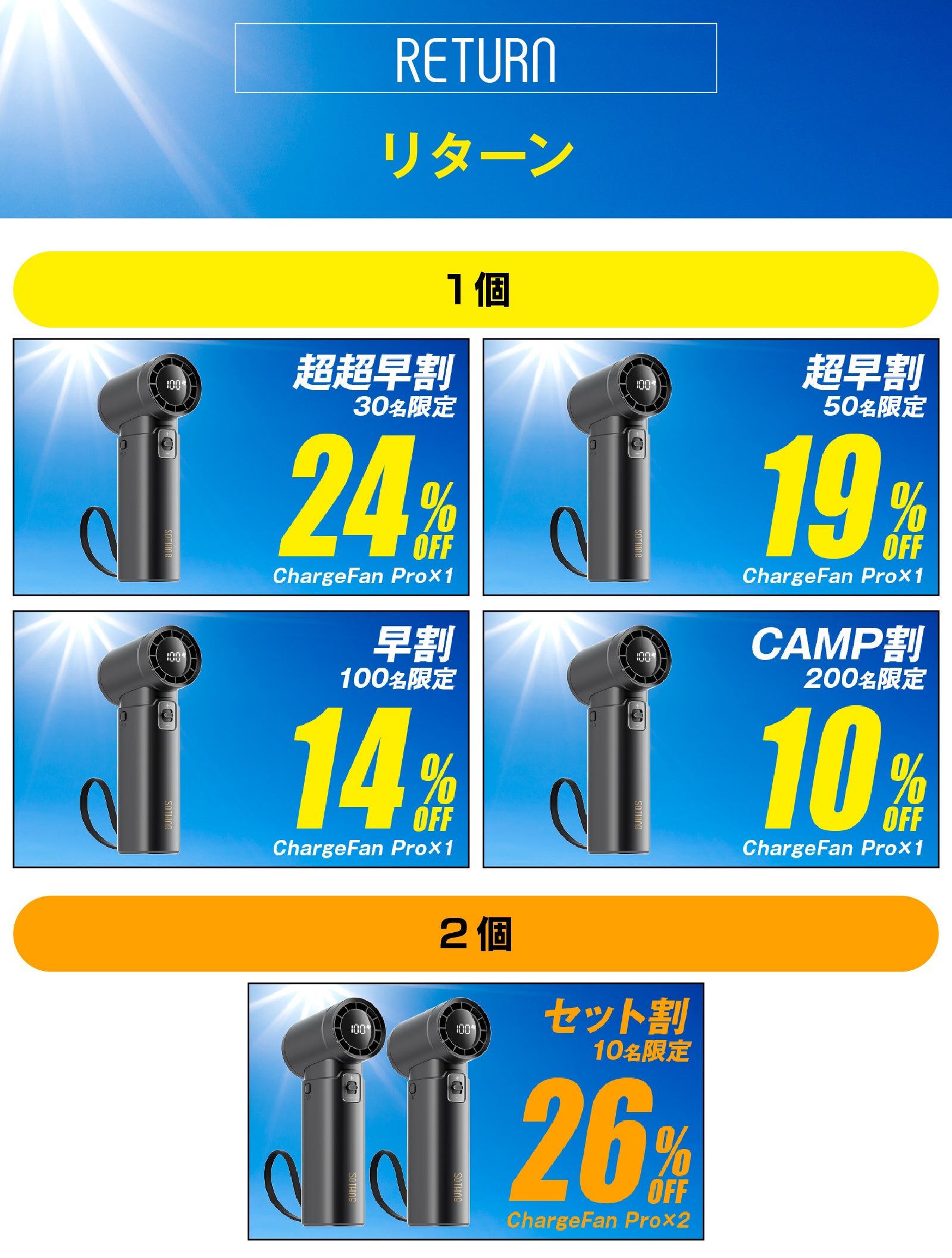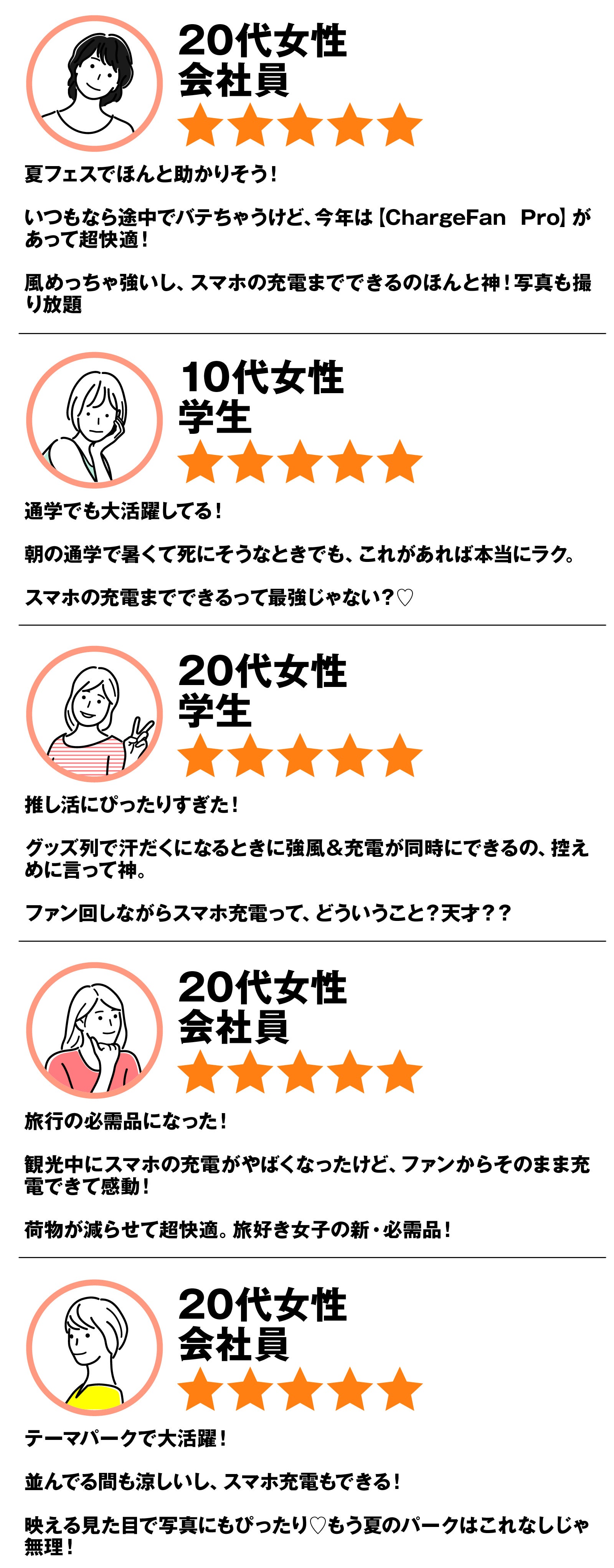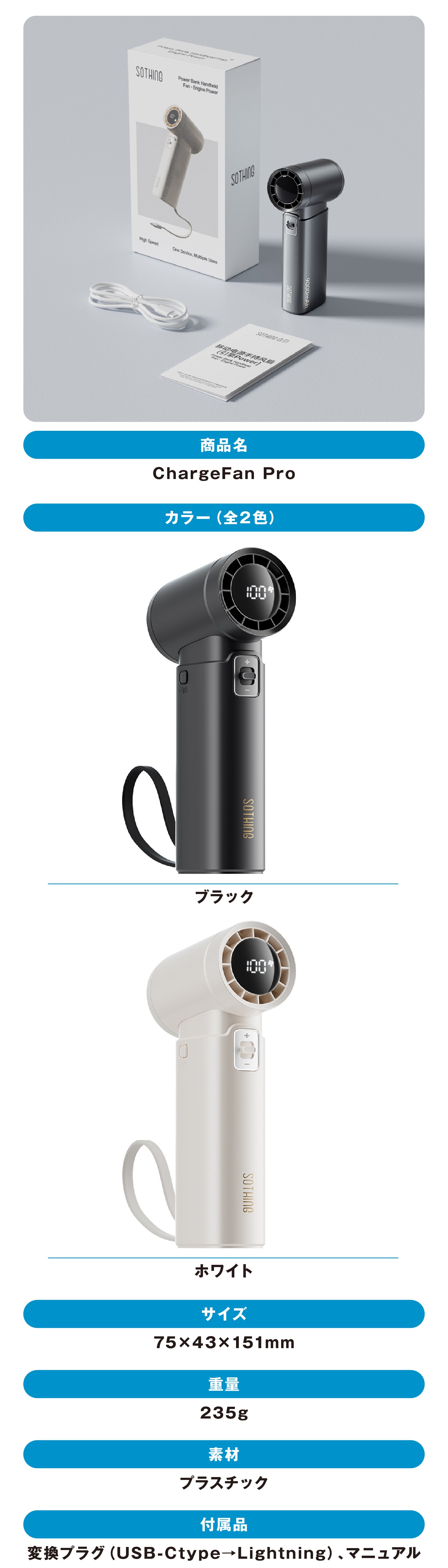 団扇や市販のハンディファンの風では物足りない方は、ぜひ【ChargeFan Pro】のパワフルな風を体験して下さい!