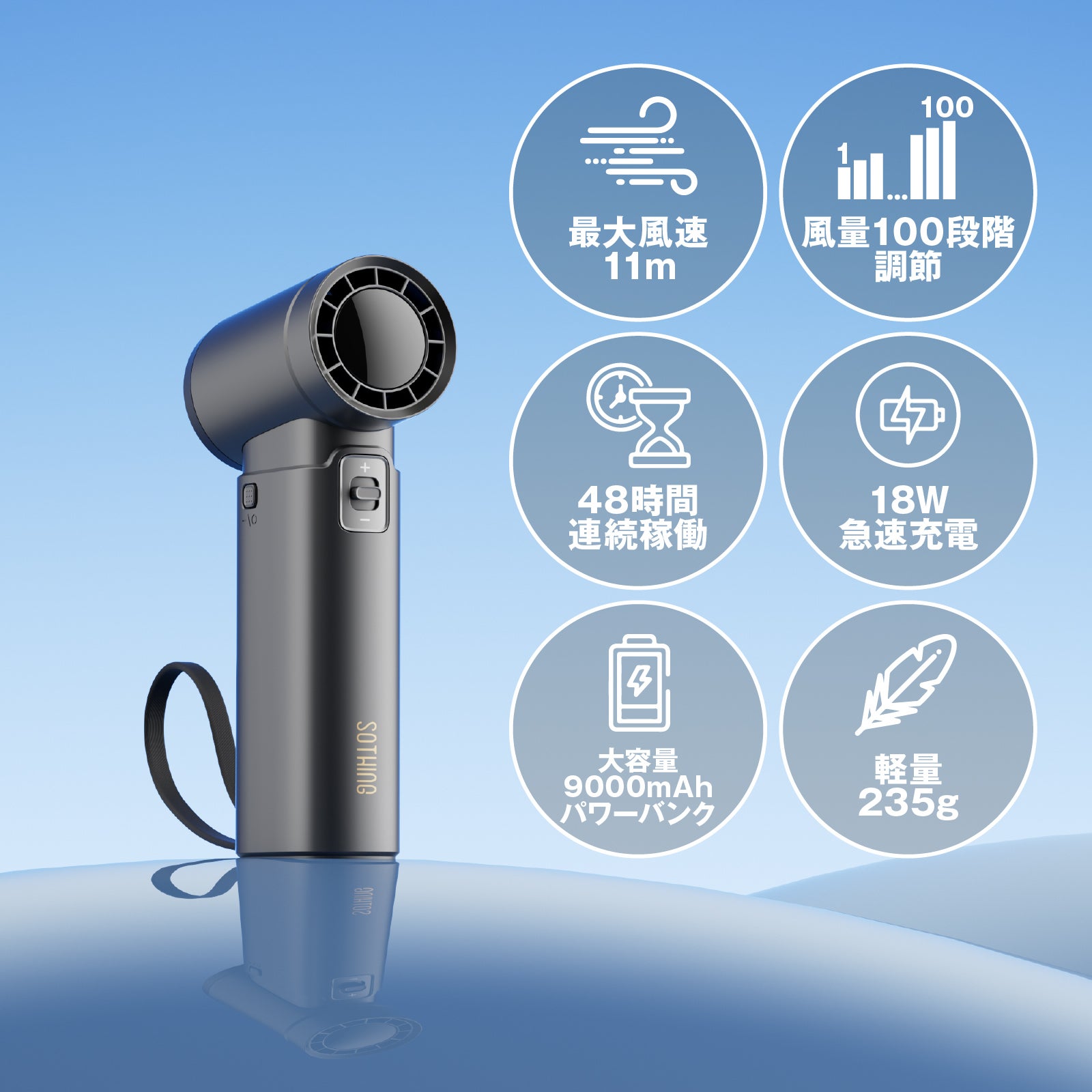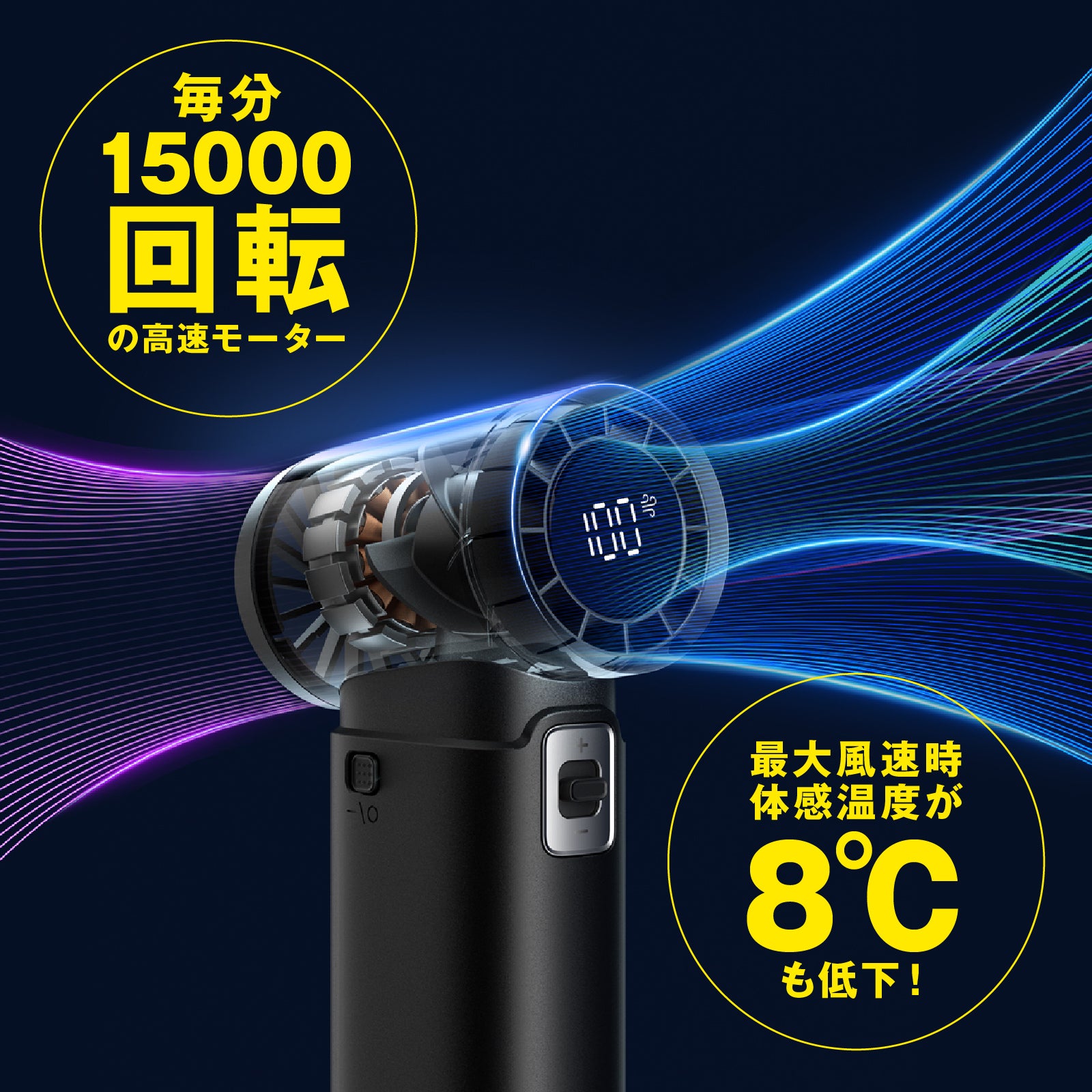 【ChargeFan Pro】は最大風速11mの強風を作り出し、体感温度を8℃も下げるハイパワーのハンディファンです。