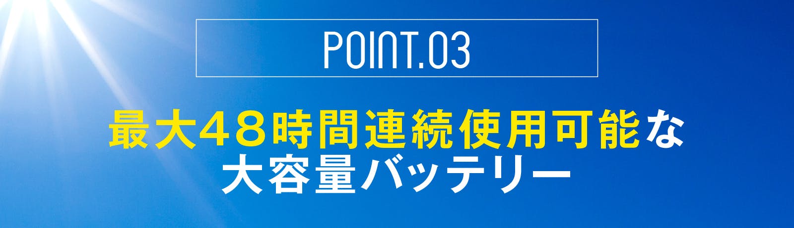 A. 弱風なら最大48時間使用可能です。バッテリー残量もLED表示でわかります。