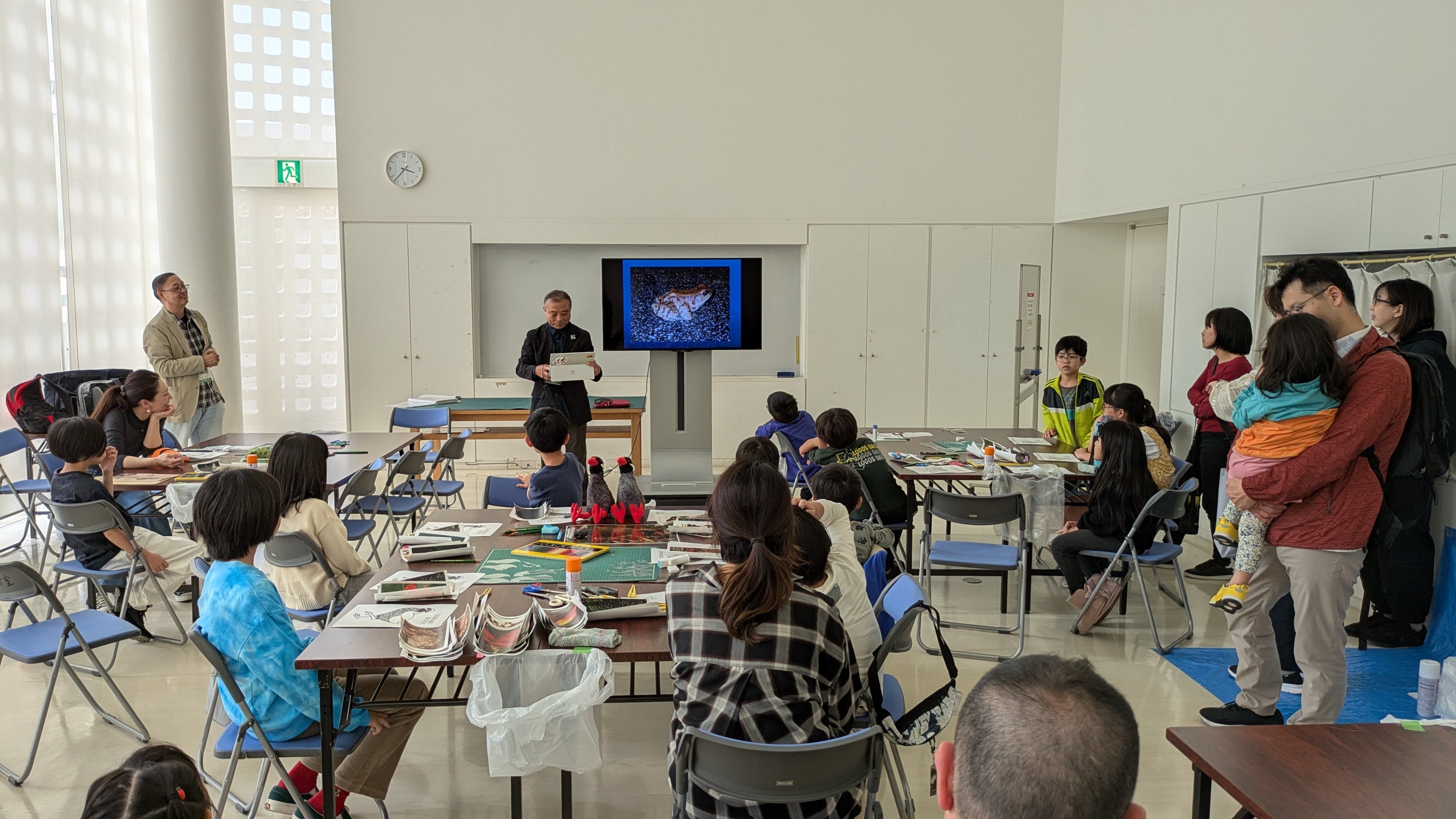 ワークショップでは、ヤンバルクイナなどの希少種の生態を学びながら落ち葉や植物の画像を用いて希少種の切り絵を作成しました。