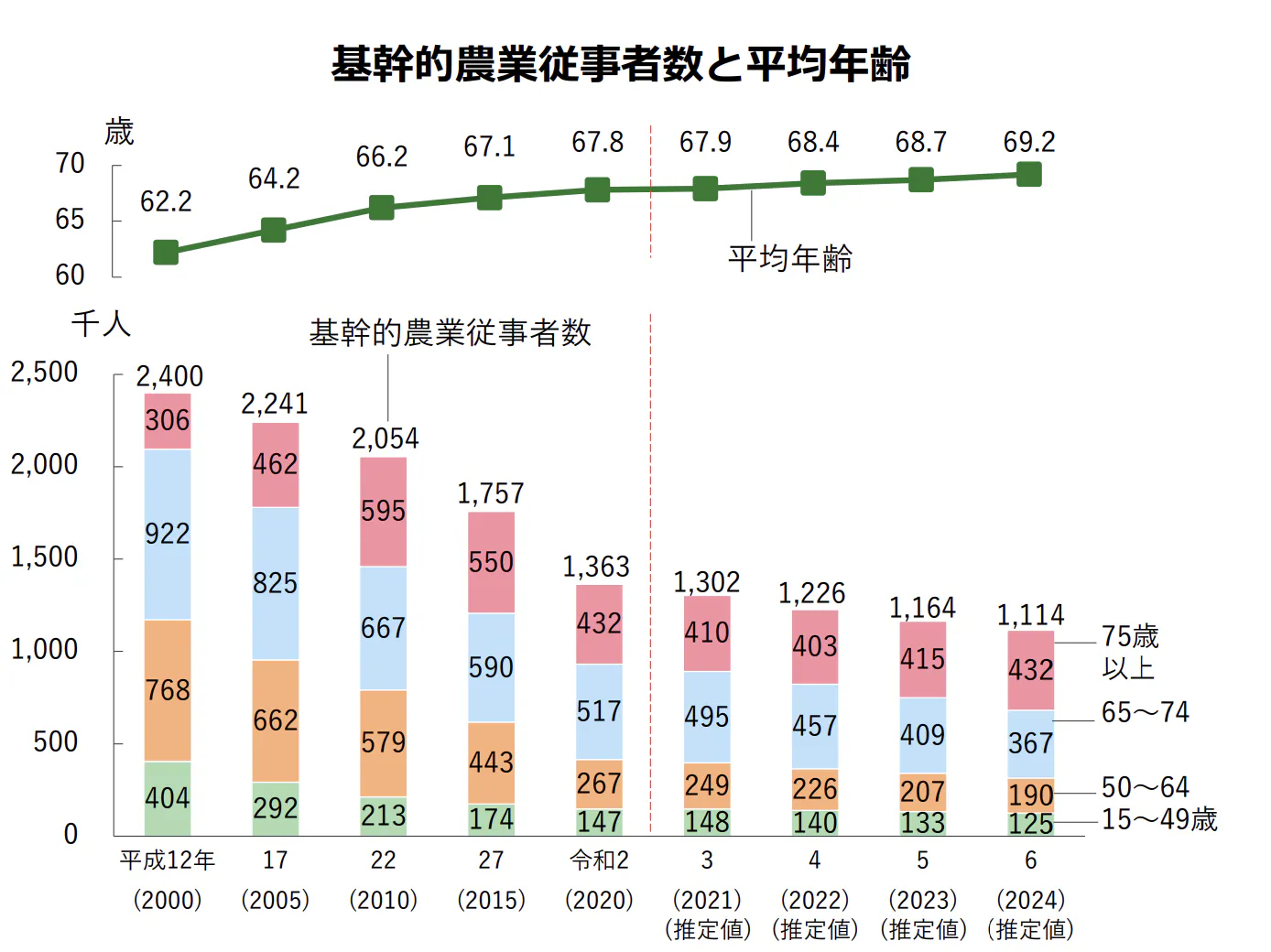 現在、日本の農業は深刻な「高齢化」と「後継者不足」という危機に瀕しています。農家の平均年齢は69.2歳に達し、この20年で農業従事者は半数以上も減少しました。