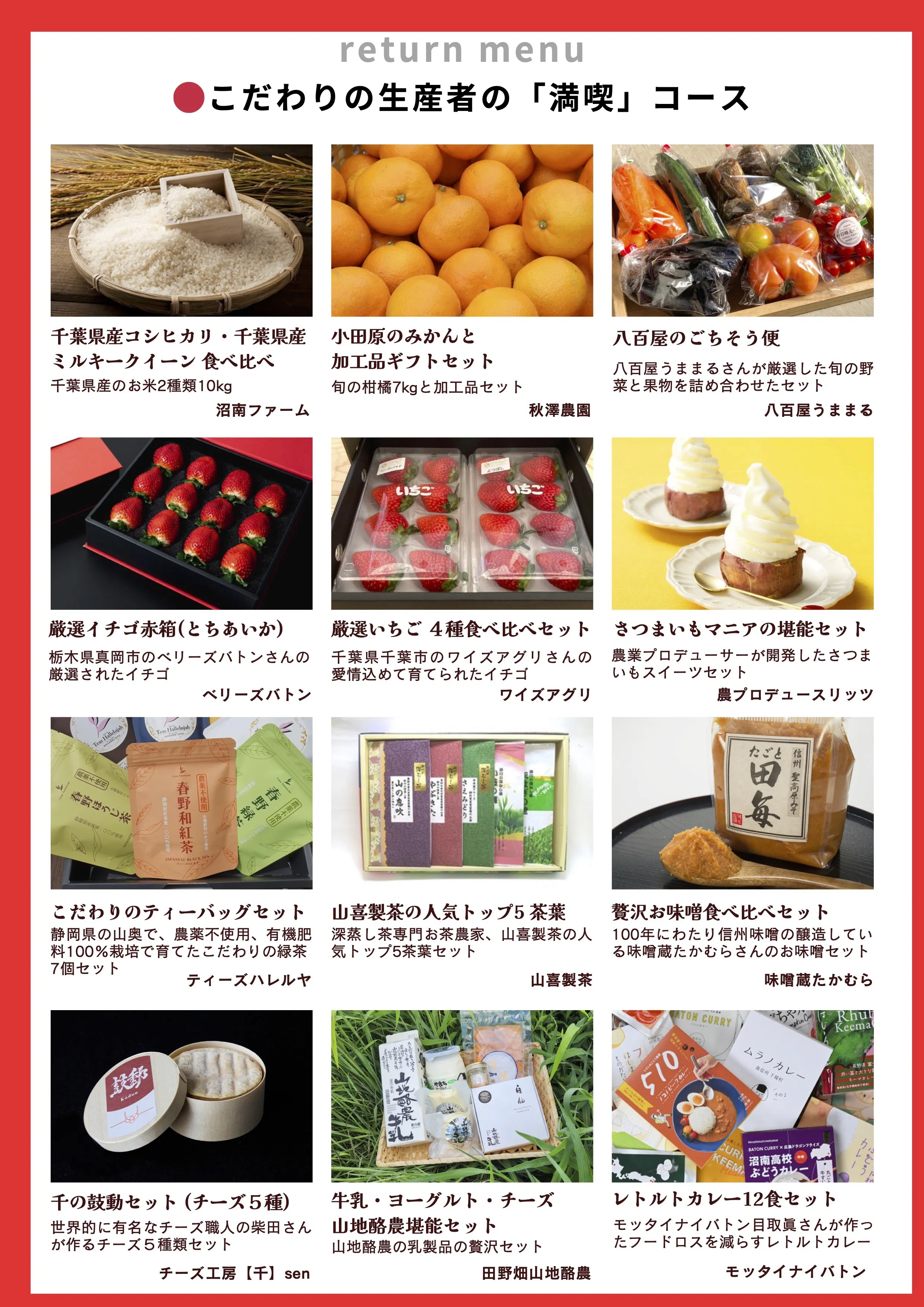 - 私たちが活動の中で出会ったこだわりの生産者さんたちが作る「本当に美味しい」生産品をお届けする「満喫」コースです。逸品コースより少し豪華なセット、または高単価なリターンとなります。