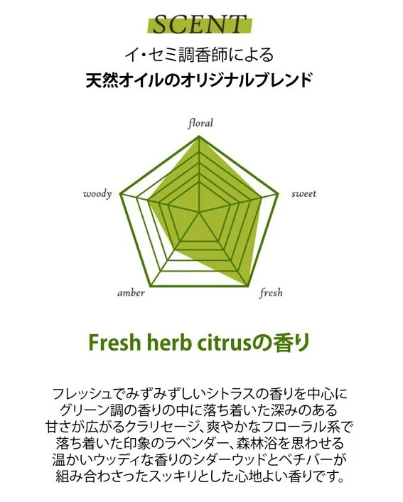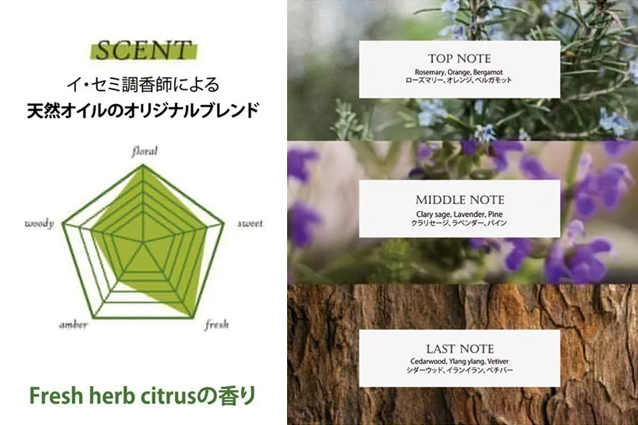 調香師イ・セミ氏によるオリジナルブレンド、フレッシュハーブシトラスの香りとともに、心とお肌に心地よいひとときを感じてください。