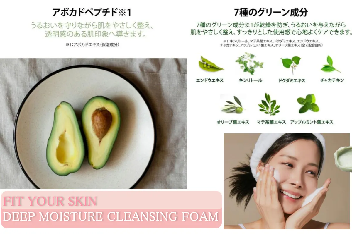 緑色のクリーミーなテクスチャーと、モイスチャーバブルがお肌をしっとり優しく洗います。肌をやさしく整え、透明感のある肌印象へ導くアボカドペプチド※1配合。エンドウエキス・キシリトール・ドクダミエキス・チャカテキン・オリーブ葉エキス・マテ茶葉エキス・アップルミント葉エキスの7種のグリーン成分※2が、うるおいを与えながら肌をやさしく整え、すっきりとした使用感で心地よくケアできます。洗顔後もつっぱりにくい、弱酸性。