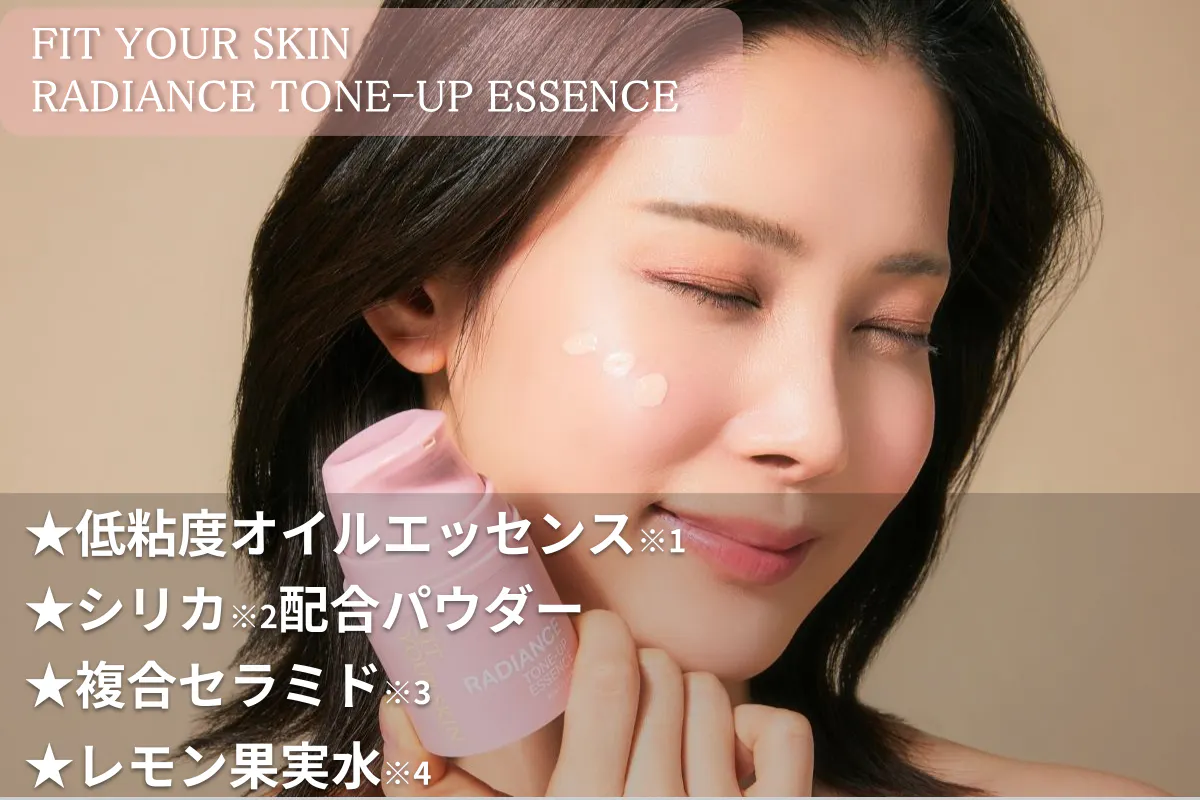 低粘度オイルエッセンスをたっぷり配合し、みずみずしい使用感で、塗った瞬間からうるおいが広がるトーンアップエッセンス。肌に自然なツヤとうるおいを与え、光をまとったようなつややかな印象※1へ。シリカ※2配合パウダーが肌表面をふんわりと整え、さらりと軽やかな仕上がりに導きます。複合セラミド成分※3配合でお肌を優しくしっとりと心地よい仕上りへと導きます。レモン果実水※4に含まれるビタミンCやビタミンB群が肌にうるおいとみずみずしさを与え、すこやかに整えます。