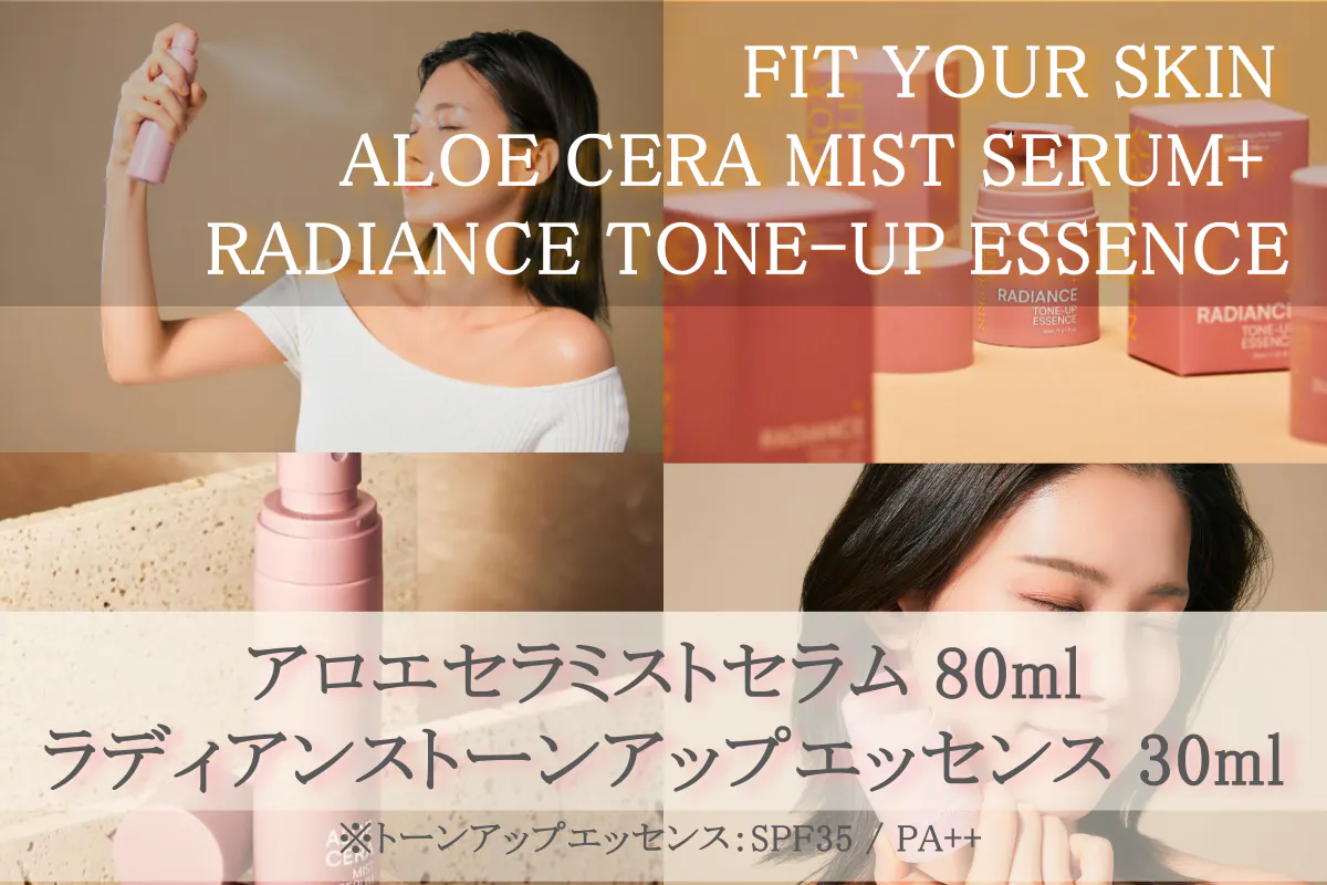 FIT YOUR SKIN一押しのアロエセラミストセラムと、ワントーン明るいツヤ肌に仕上がるトーンアップエッセンス(SPF35 / PA++)のセットです。今回だけの特別価格にてご提供いたします。※送料込みの価格です。