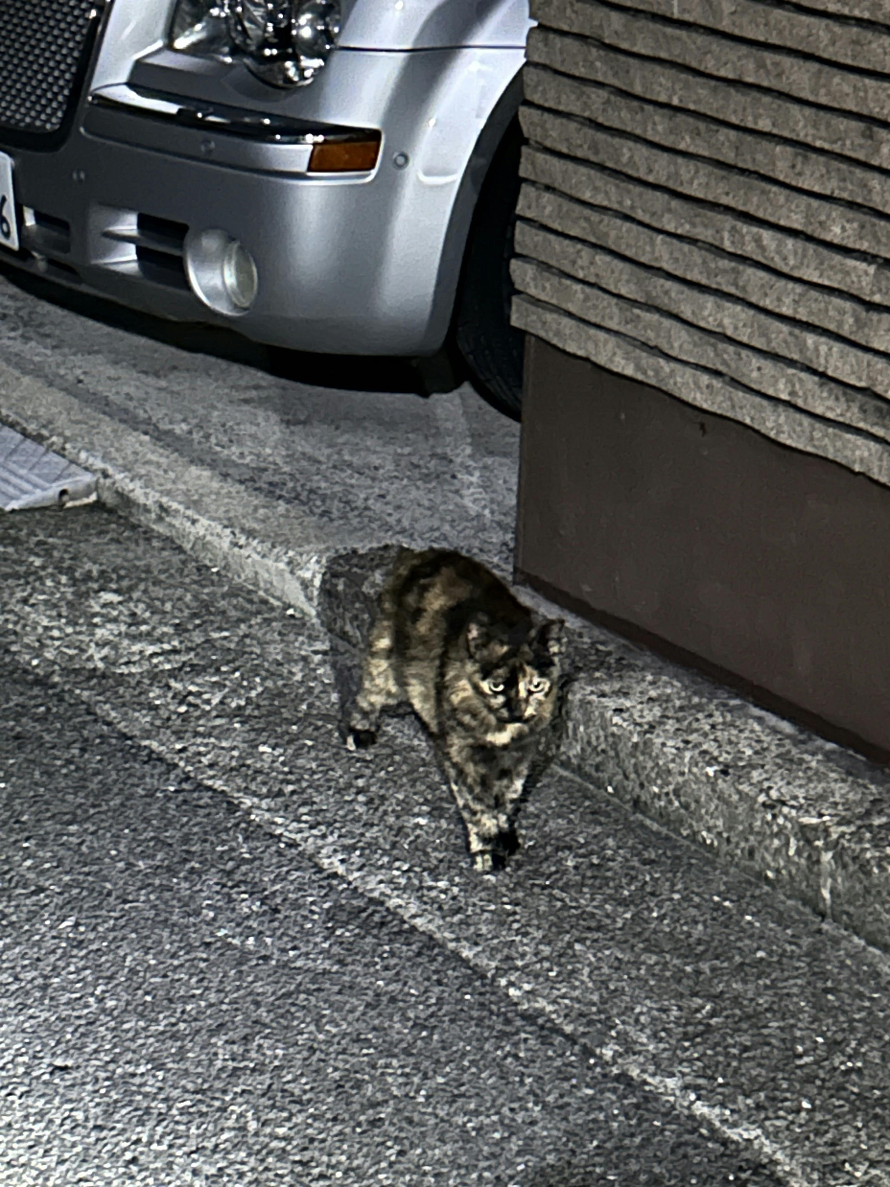 もう1匹の三毛猫さん.昨日も捕獲器を持って待機したけど姿なし。ニャーゴはおそらく先にこっちに来たんじゃないかな?白猫サブローしか居なくて,器回収に行った際にヒョコって出て来た。