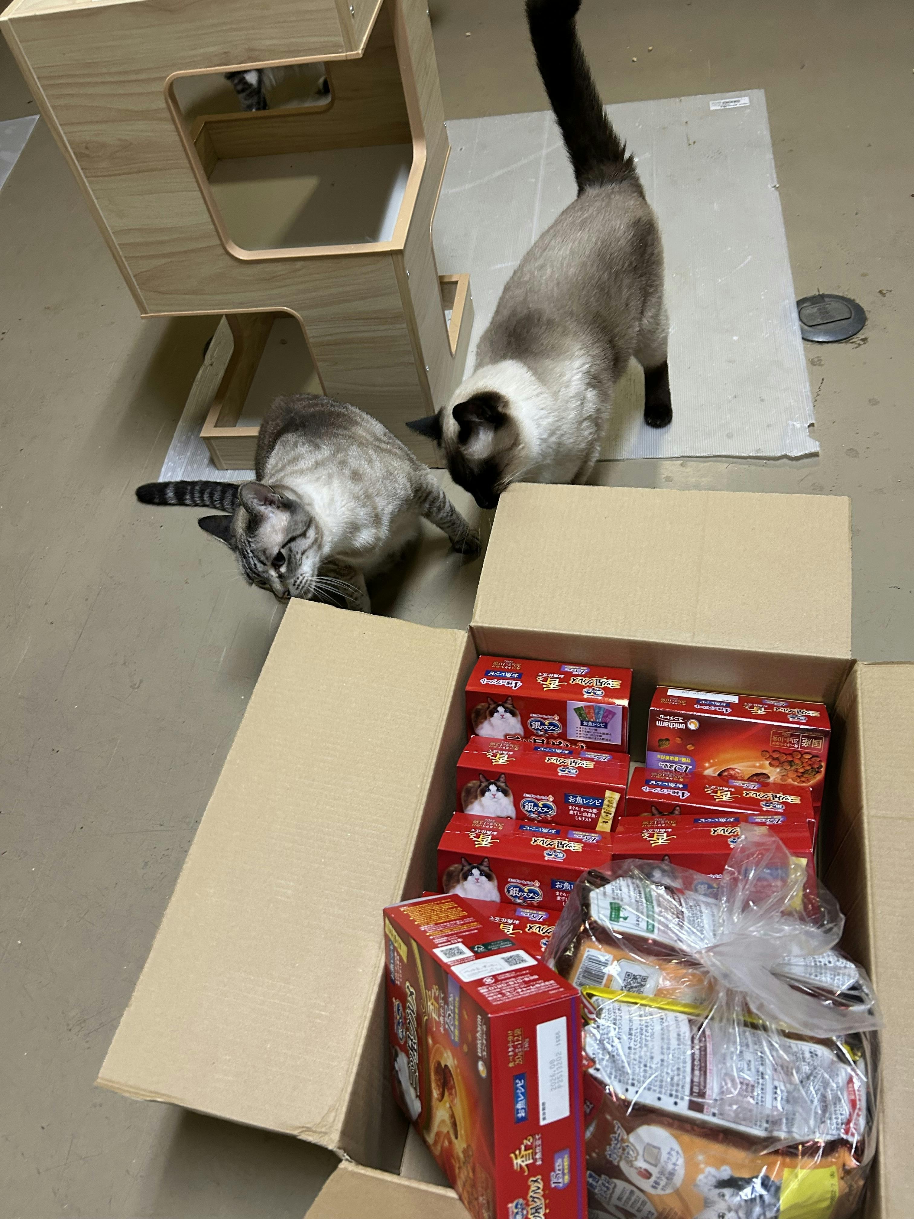 真夜中にシェルターに掃除と給餌に行ったら部屋の前に大きな段ボールが二つ!