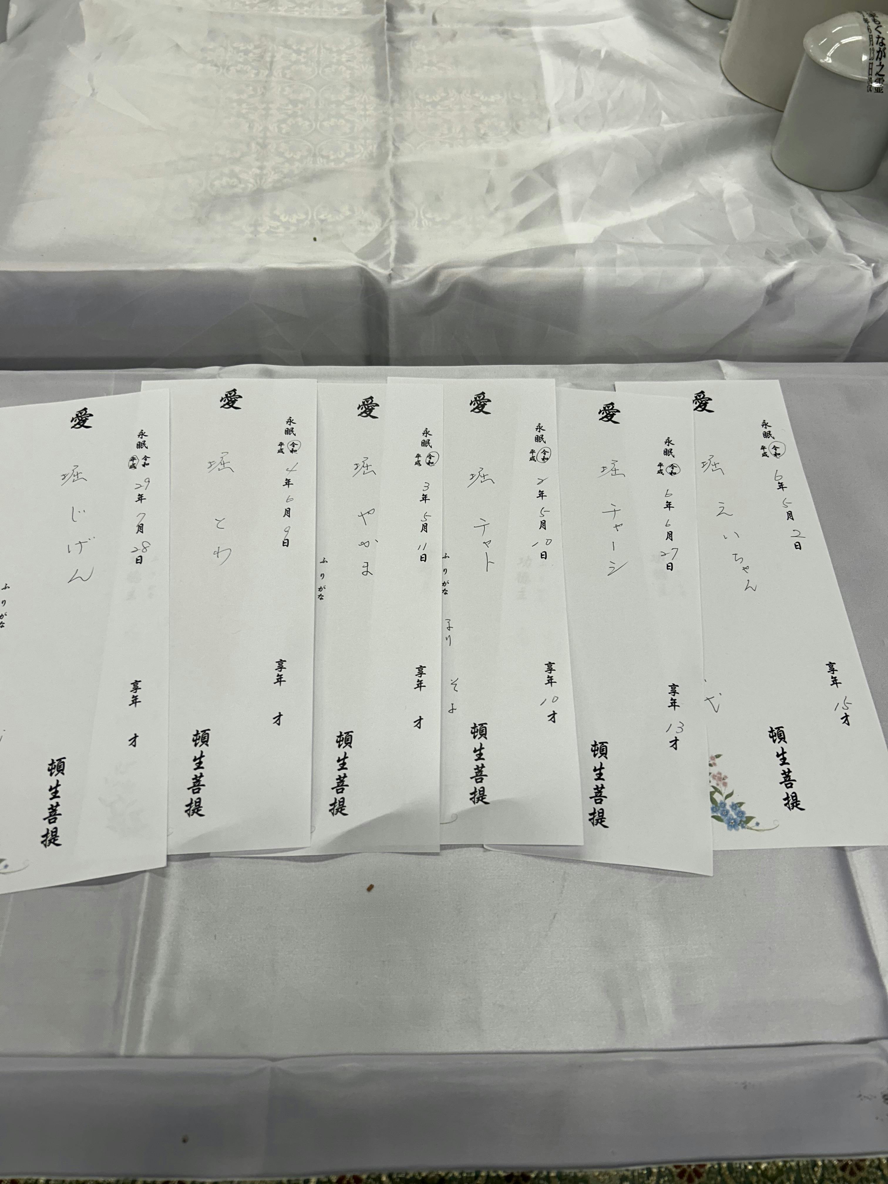 優しいお経を唱えてくださるお坊さんで、気持ちが落ち着きます。愛した子達の顔や仕草、交わした会話が心に浮かびました。