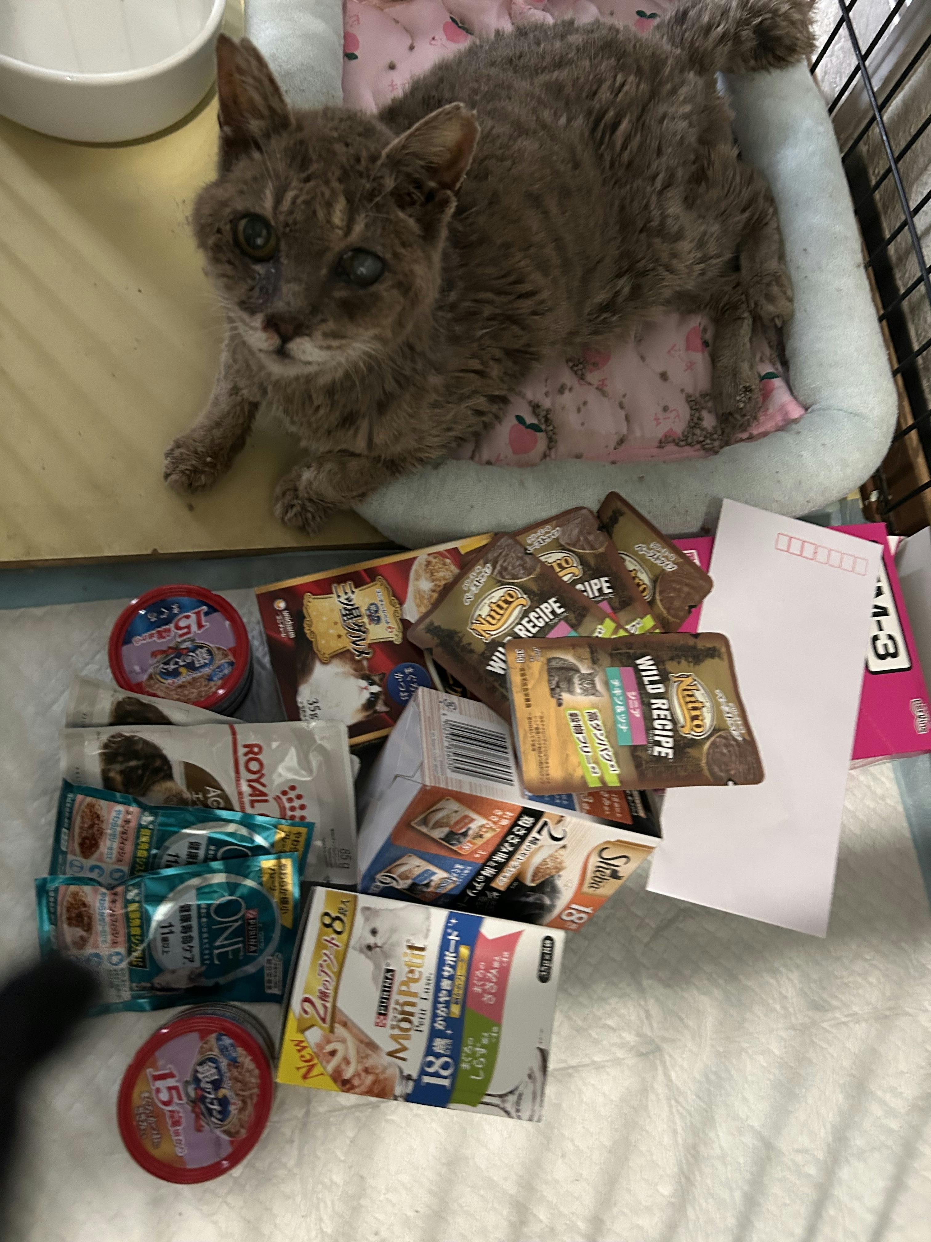 暑い中、シェルターまで届けてくださりありがとうございました.外で暮らしてた,みーちゃんを気にかけてくださってた事も嬉しかったです。みーちゃんの顔、日に日にお家猫になってきてます.たくさんのフードとご支援金をありがとうございました。