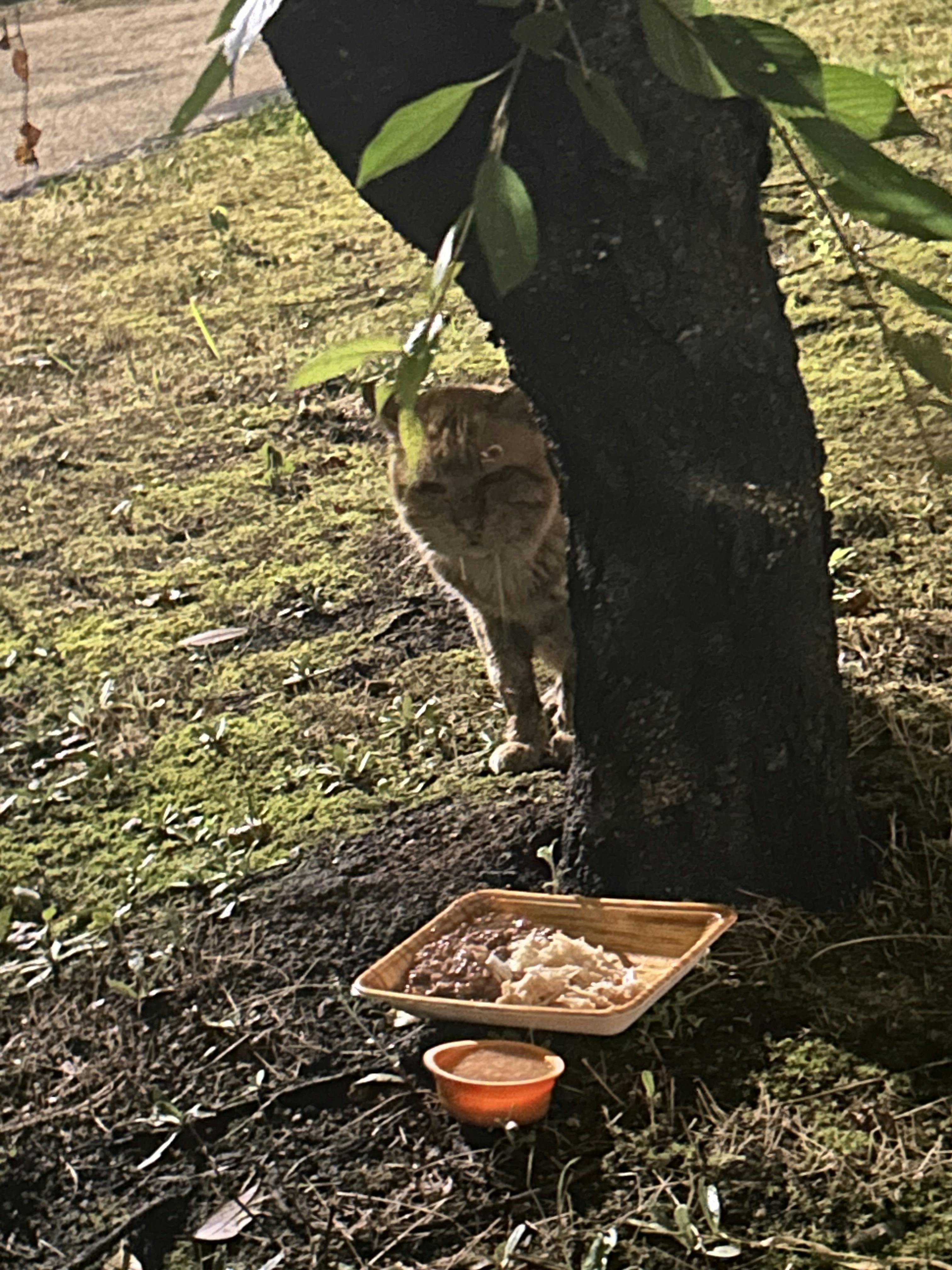 どうぞ食べてね!と置いてシェルターにいきました。小1時間,シェルターで過ごし器を回収にきたら,お見事完食してくれてました。嬉しいな。可愛いな。だからボランティアはやめれない