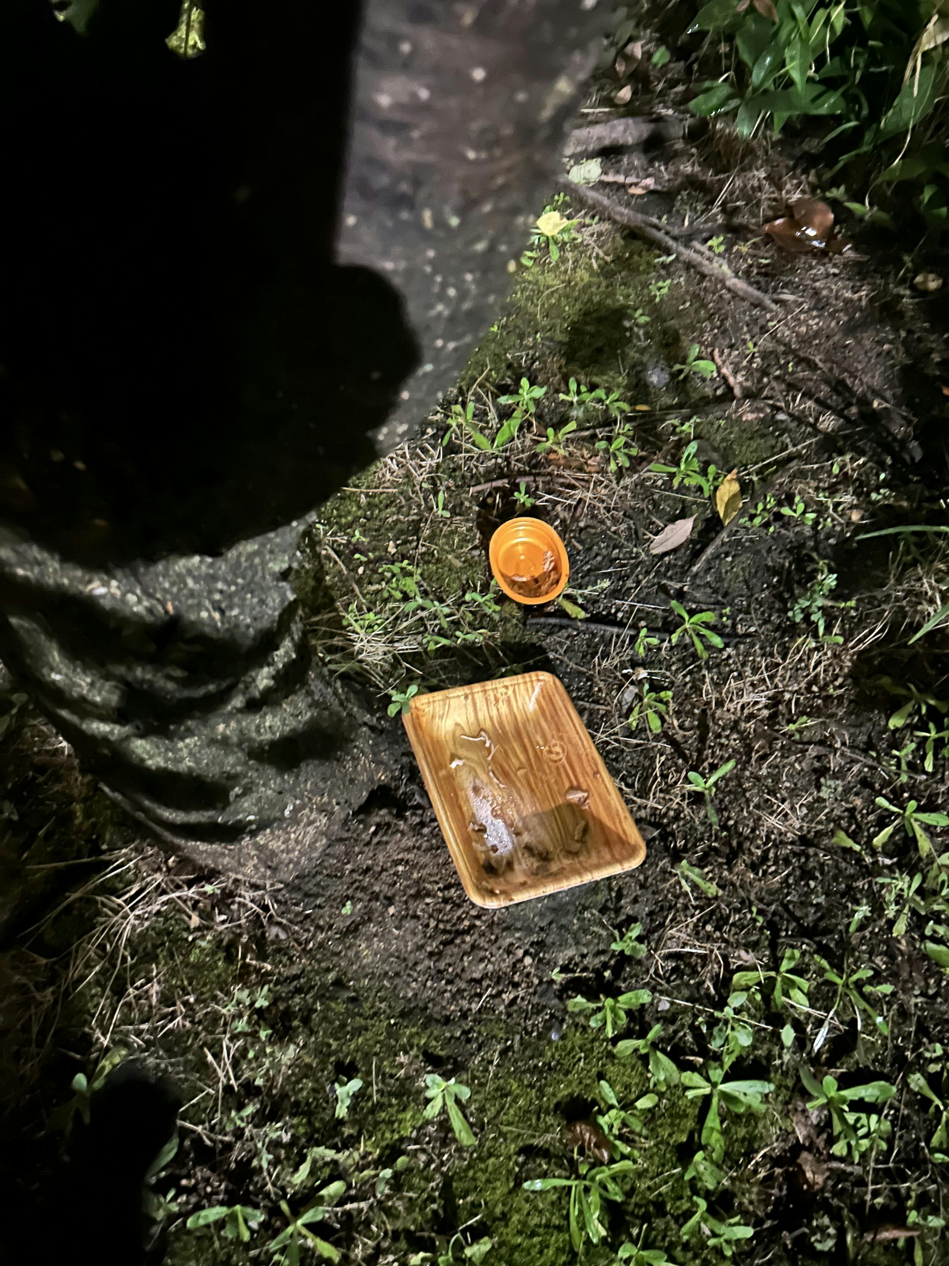 15日 am3:00頃に器を回収に来たらイナバササミほぐしたのだけが無くなってた。周りを見渡すと,伏せの状態でいた。大好きカツオを食べてなかったから,今度はトロトロ缶とササミを器に入れ,薬を隠した。横にオレンジカップを添えて。