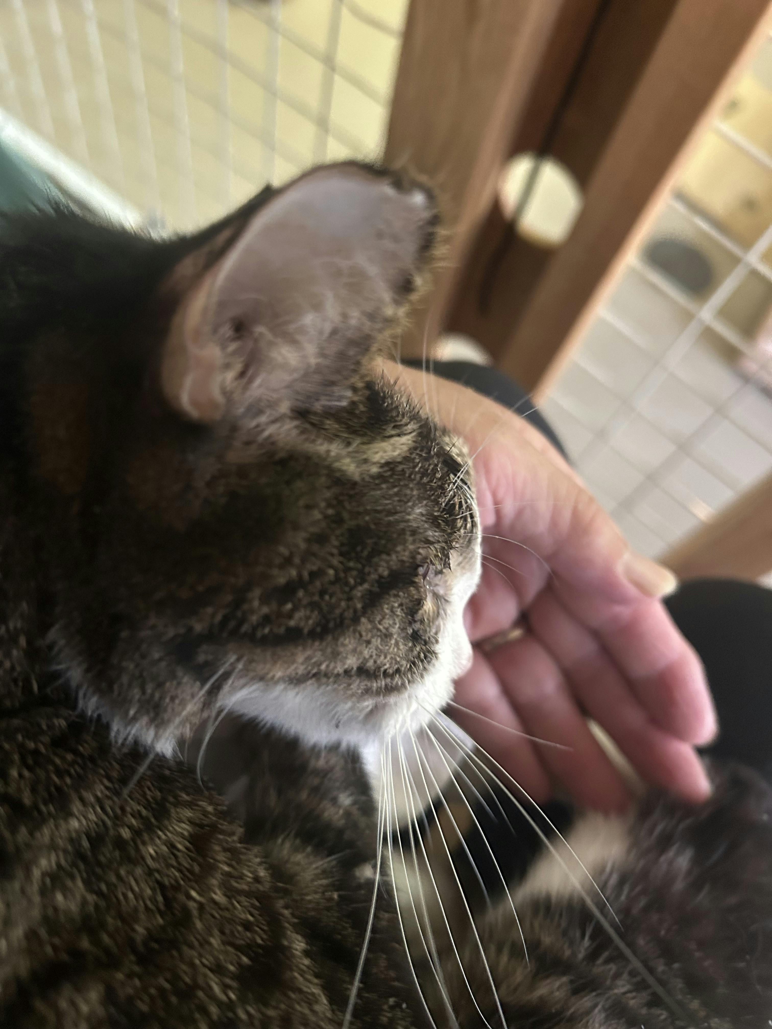 なっちゃんを膝に抱き静かに過ごしてます。目の癌が大きくなり血が滲んてす。ペットに血がつきます。