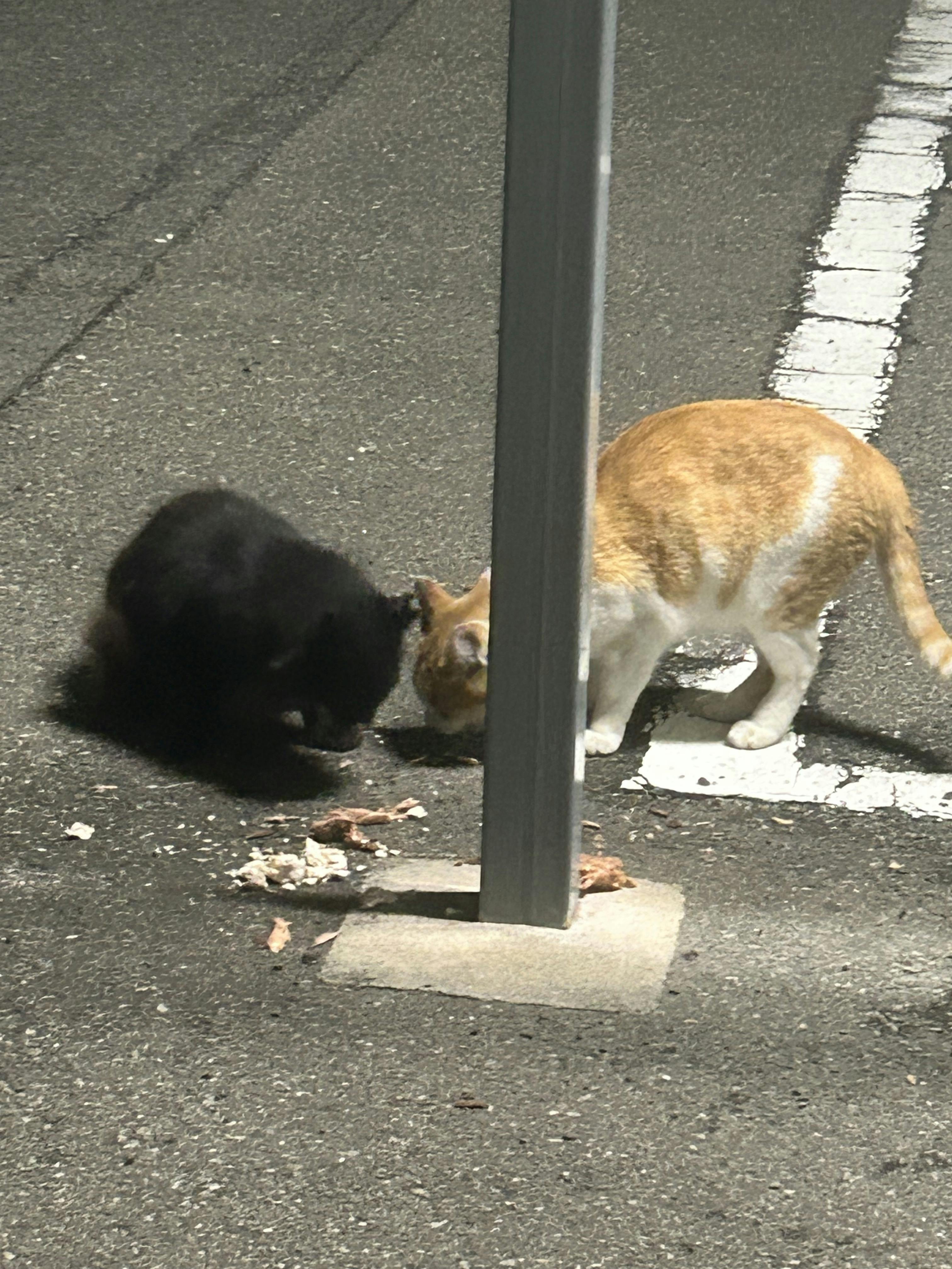 チャトラくん 写真は撮れなかったけど,茶色猫が車の下にサッと隠れたのを見ました。1回目に来た時に置いたフードを食べていたみたいです。回収した器は空っぽになってました。