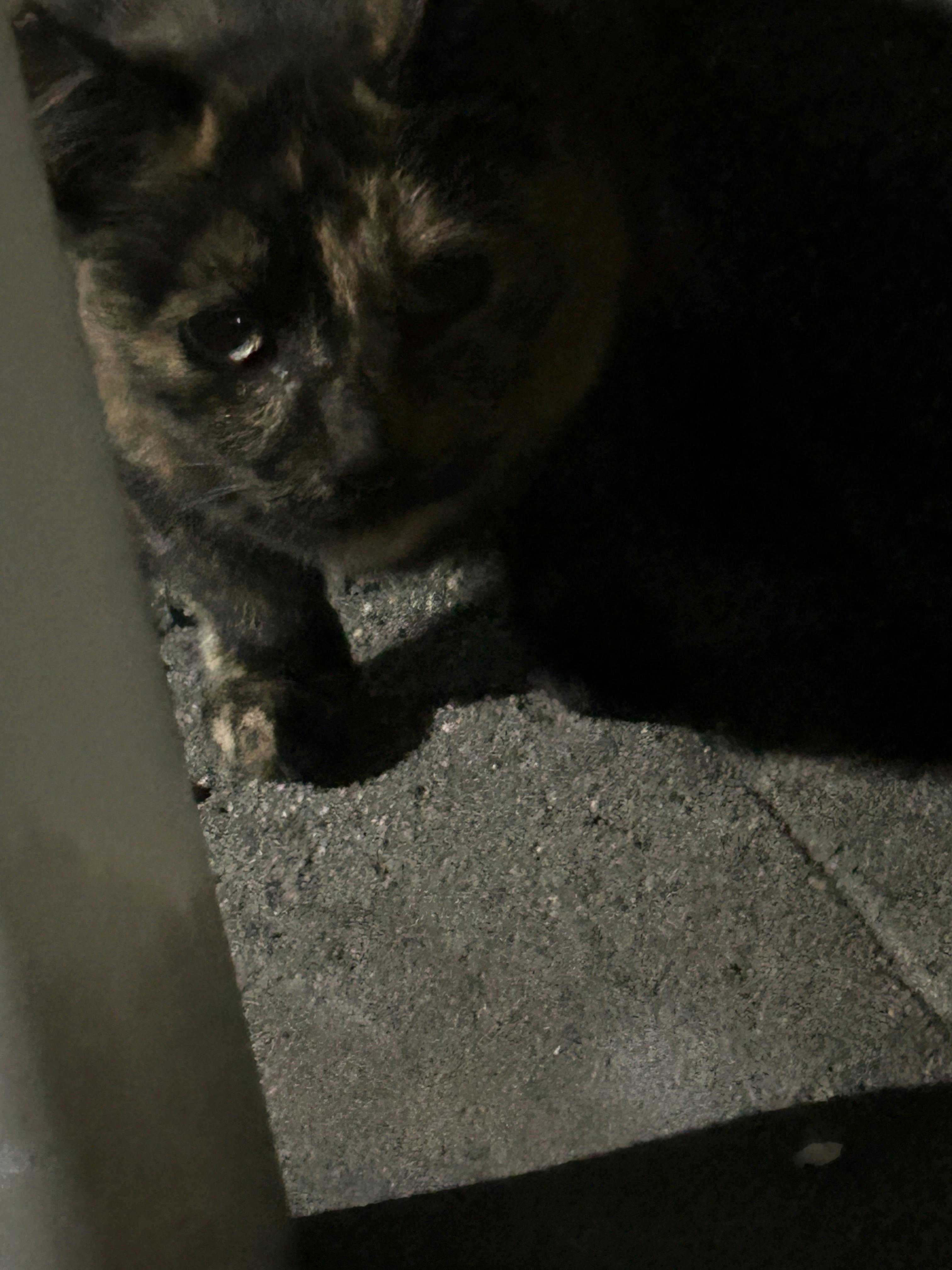 何度も様子を見に行き、サビちゃんは4回目に出て来てくれました。日中にフードをあげてくれてる家はあるので大丈夫なのですが,やっぱり会わないと気になります。近くから顔アップ撮影させてくれました。