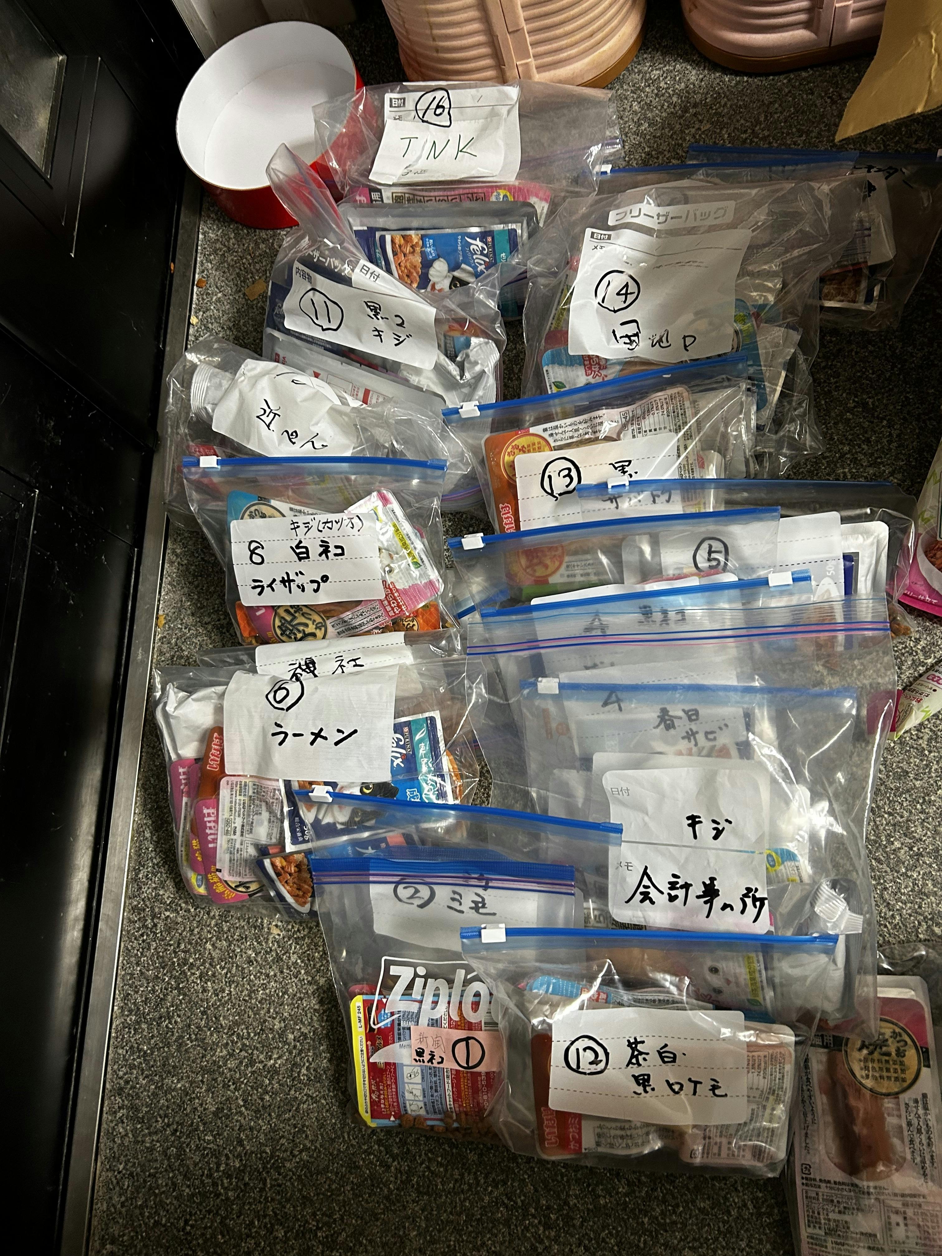 皆様の応援で23日 夜の配達を休みます。アルバイトの方に配ってもらうフードを1箇所づつパックにしました。17箇所です。