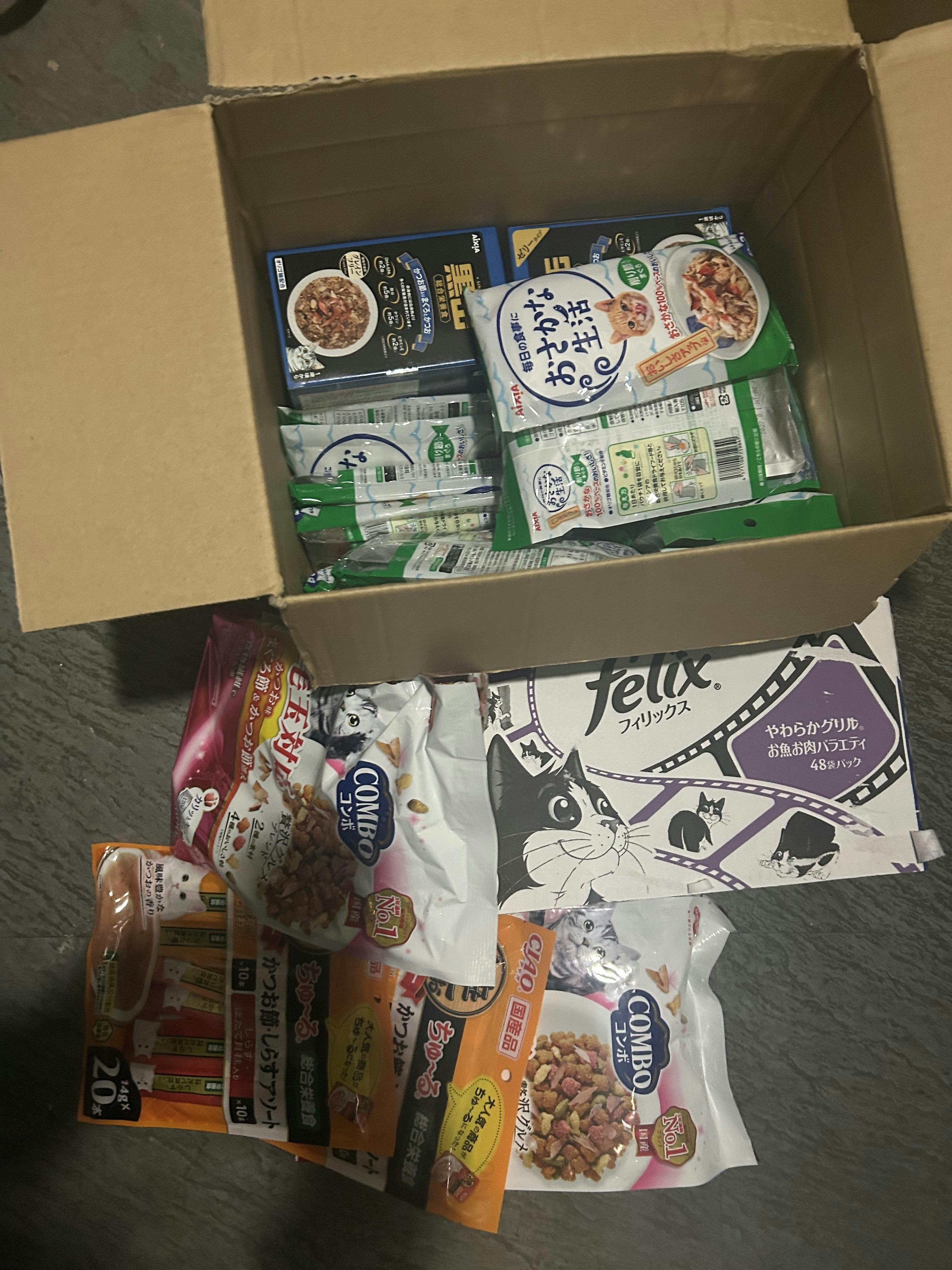 母を連れて横浜に行ってきて大阪に戻ってきてデカと三毛とサビちゃんに会って方から,すぐにシェルターに来ました。掃除をお願いした友から、ミおばあちゃんが静か過ぎるってLINEがきてたので心配したけど、いつものミおばあちゃんで安心しました。今から5匹のニャンにフードをあげて家に戻り、後半猫のフードを湯煎します。ササミも茹でます。美香さん ありがとうございました。箱の中から,いっぱい出てきました。早速,いただきまーす!しました。ありがとうございます。外猫達に配ってきます〜。