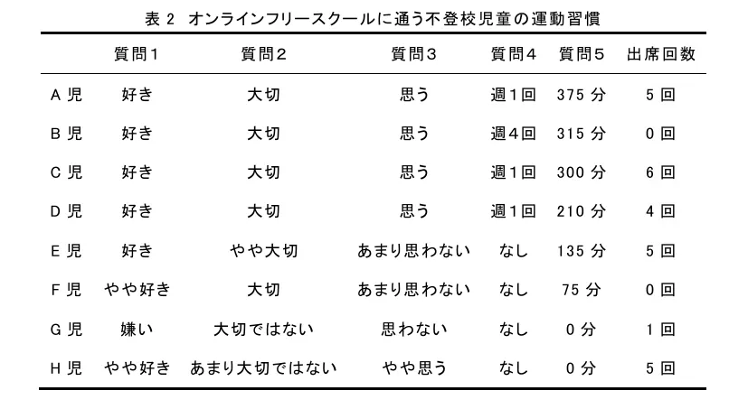 これは、オンラインフリースクールに通う不登校児童の運動習慣を調査したものです。