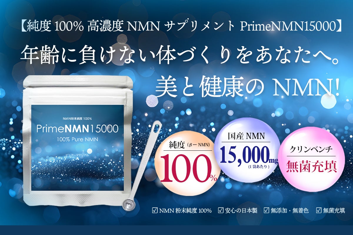 - PrimeNMN15000は、話題の成分「NMN(β-ニコチンアミドモノヌクレオチド)」を1袋あたり15,000mg配合。国内製造・高純度(100%以上)の原料を使用し、日々の健康維持をサポートします。