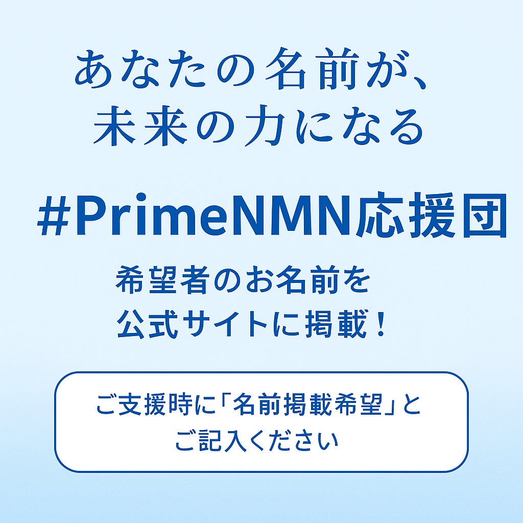 🎉 ご支援いただいた皆さまの中で、私たちの挑戦に共感し、名前を刻みたいという方へ。プロジェクト終了後、自社サイトにて「#PrimeNMN応援団」として、あなたのお名前(ニックネーム可)を掲載させていただきます。ぜひ一緒に、このブランドの第一章を飾ってください。