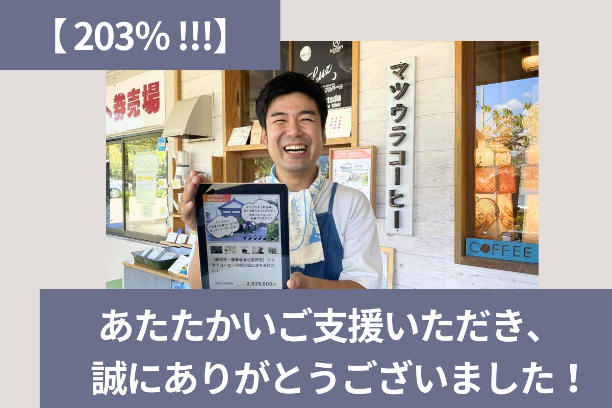 2025/08/31 21:43マツウラコーヒーを応援いただき、ありがとうございます!本日(8月31日)、マツウラコーヒーのクラウドクラウドファンディング最終日!これまでに、176名の皆さまより、2,026,600円のご支援いただいています!!!マツウラコーヒーのホットコーヒーに換算すると、なんと3,377杯!!!3,377杯なんて、、、本当に本当にありがとうございます(感涙)皆さまからのご支援が、身に沁みます。マツウラコーヒーのCampfireさんでのクラウドファンディングは、本日が最終日ですが、マツウラコーヒーの現店舗での営業は、9月30日(火)までとなっております。まだまだ残暑厳しい日々が続いていますが、蓮華寺池を望むマツウラコーヒーをお楽しみいただけましたら、嬉しいです♪マツウラコーヒーを応援いただき、お引き立ていただき、心より感謝しています!マツウラコーヒー松浦一樹 もっと見る