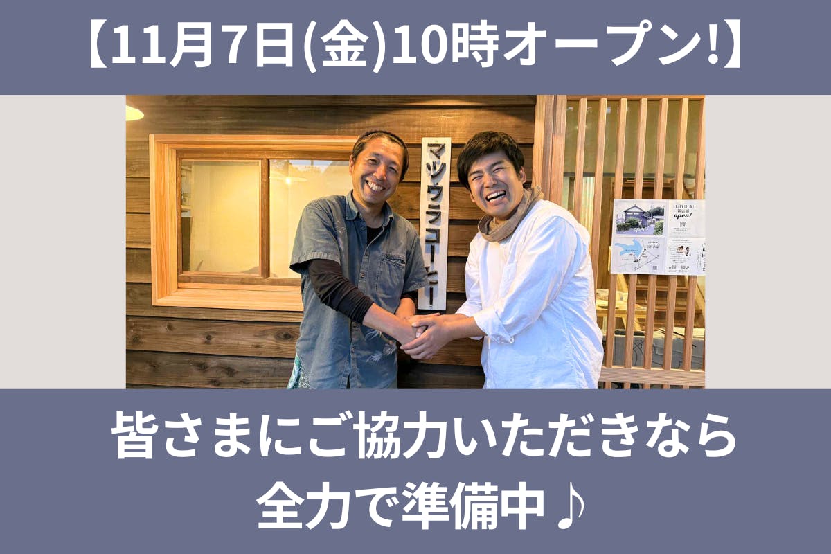 2025/11/06 19:12マツウラコーヒーを応援いただき、ありがとうございます!クラウドファンディングをしていただき誠にありがとうございます。クラウドファンディングが終了してから早2か月強経ちました。全く音沙汰なく、大変失礼しています!おかげさまで、皆さまのご協力をいただき、やっと本日、営業許可をいただくことができ明日(11/7)より、新店舗にて営業を開始する運びとなりました!本日(11/6)、看板が設置されました!(契約後に握手した同じ場所で、建築士の山下さんと)連日、道行く方々から「窓がつきましたね!」「まだエアコンの室外機がついていなけれど大丈夫?」「壁がへこんでいるけれど、大丈夫!?」「外壁(焼杉)がすてき!」「オープンしたら来ますね♪」などなど日々、気にかけていただいているお声や励ましのお声をおかけいただきました。職人さんたちには、本当に、全力でお仕事をしていただき、とてつもなく素敵なお店をつくりあげていただきました!お庭と入口のたたきは、9sketchさんがhttps://www.9sketch.com/とってもすてきに植樹していただきました。1本1本にお名前がついているのでぜひご覧ください。明日からのオープンは、午前10時から午後5時までの営業となります。ご来店いただく皆さまには、大変お待たせしてしまったりするなど御不備をおかけしてしまうことともあるかと思いますが精一杯対応を心がけてまいります。今後とも、マツウラコーヒーをおひきたていただけますようお願いいたします。マツウラコーヒー松浦一樹マツウラコーヒー藤枝市藤枝5-5-15https://share.google/cjgsk1vE8PzWJD5xL※蓮華寺池公園のボート乗り場前の旧店舗より徒歩3分営業時間:午前10時~午後17時ラストオーダーイートイン:午後16時30分テイクアウト:午後17時https://www.instagram.com/matsuura.coffee/ もっと見る