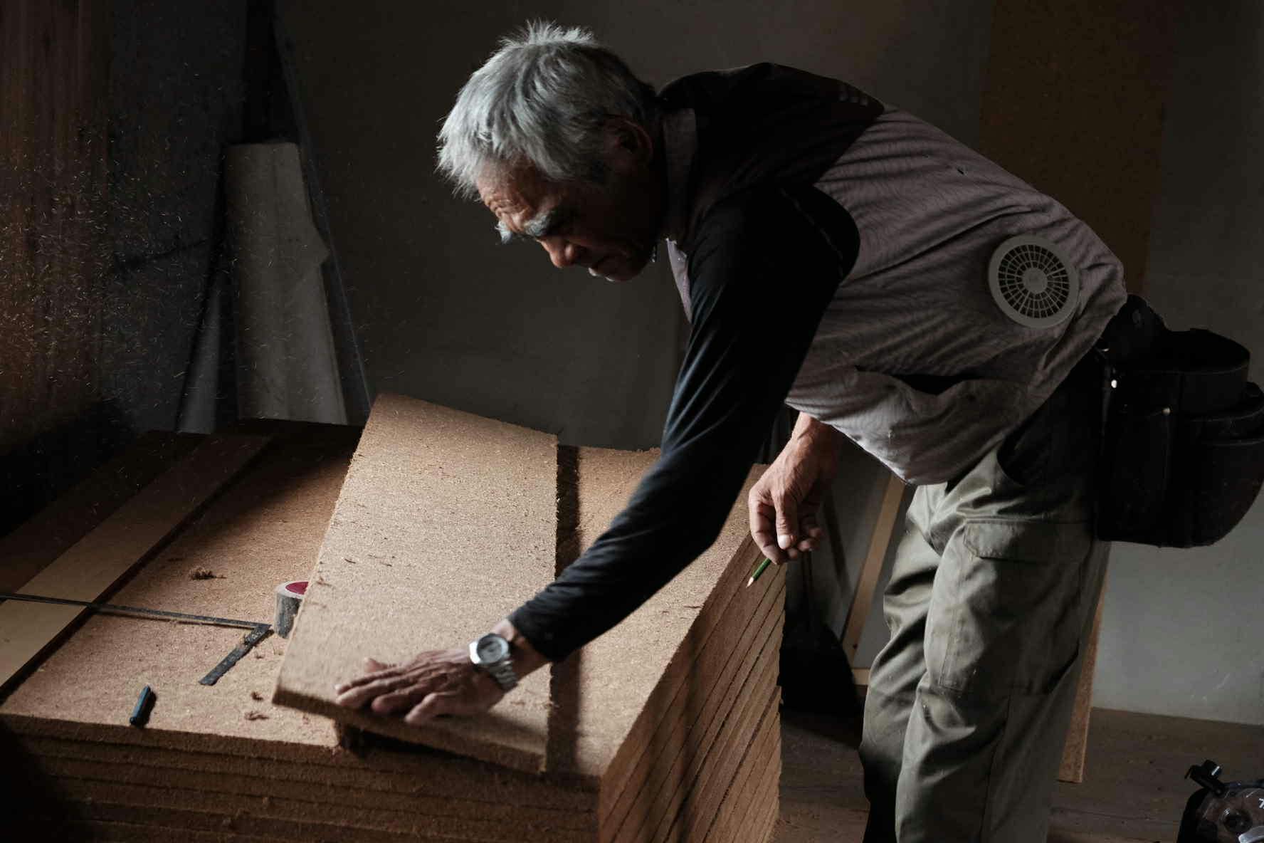 福田さんは、いつも現場にいらっしゃるとまずお掃除からお仕事を始めていらっしゃいます。ちょうど同業の方が別件で立ち寄られて、立ち話を少し。福田さんが使っている箒と同じものを使われていて、天然素材で作られていて、埃がたちにくく使いやすい!とか。ただ、どんどん材料不足ゆえか、釘も箒も価格が上がっている、というお話になりました。