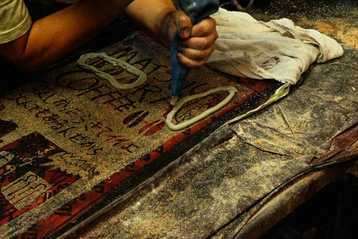 柿渋で貼り合わせた和紙に、彫刻師が手作業で文様を彫り抜きます。