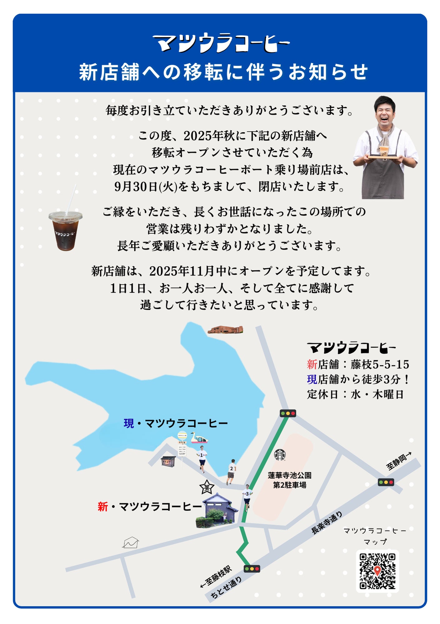 マツウラコーヒーをオープンした当初の2016年は、想い描くことができなかった景色を、皆様のおかげさまで現在は日々見させていただいています。マツウラコーヒーの新店舗へも、皆様にご来店いただき、ホッとひと息ついていただいたり、身が「♪」となるような喫茶のご提供、新たな出会いの場になる仕掛けを思案しつつ、蓮華寺池公園旧東海道の商店街繋ぐお店に育てていきたいと思っています。