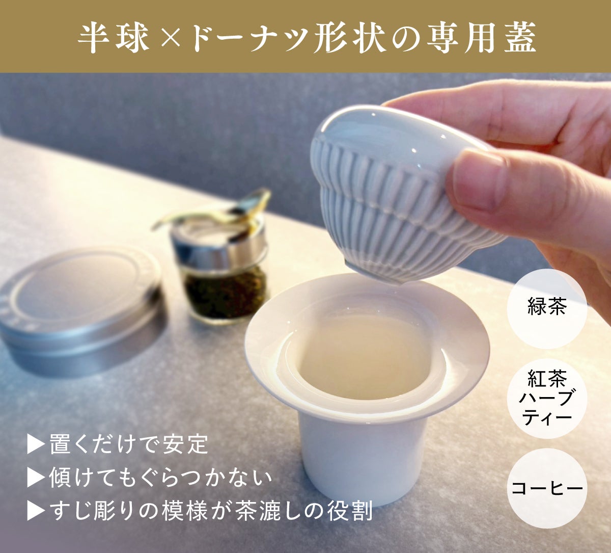 半球状の蓋底部は置くだけで安定し、傾けてもぐらつかない設計。