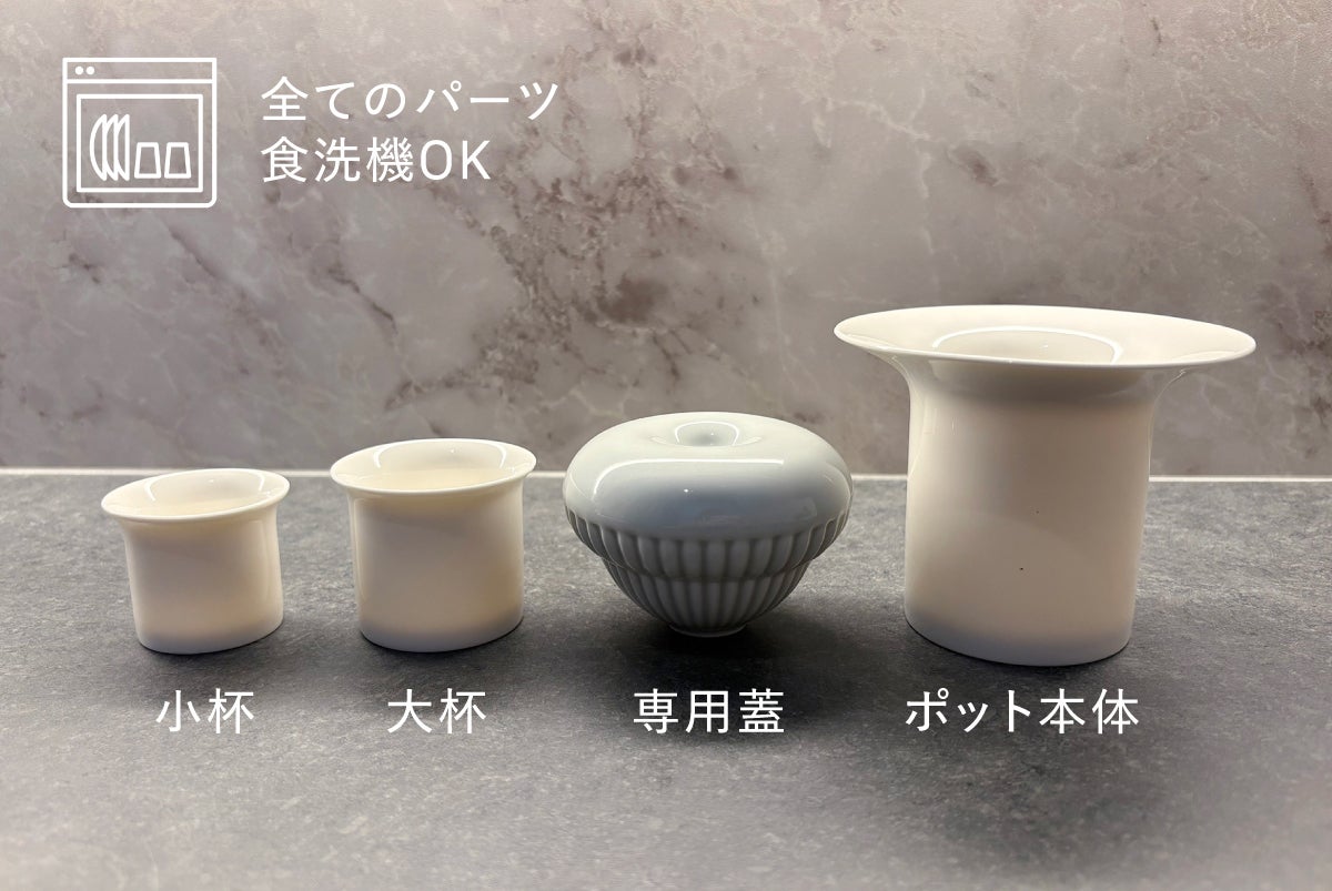 A. ポット本体、専用蓋、茶杯(小・大)すべてのパーツに高品質の陶磁器を使用しています。日常使いはもちろん、来客用としてもおすすめです。