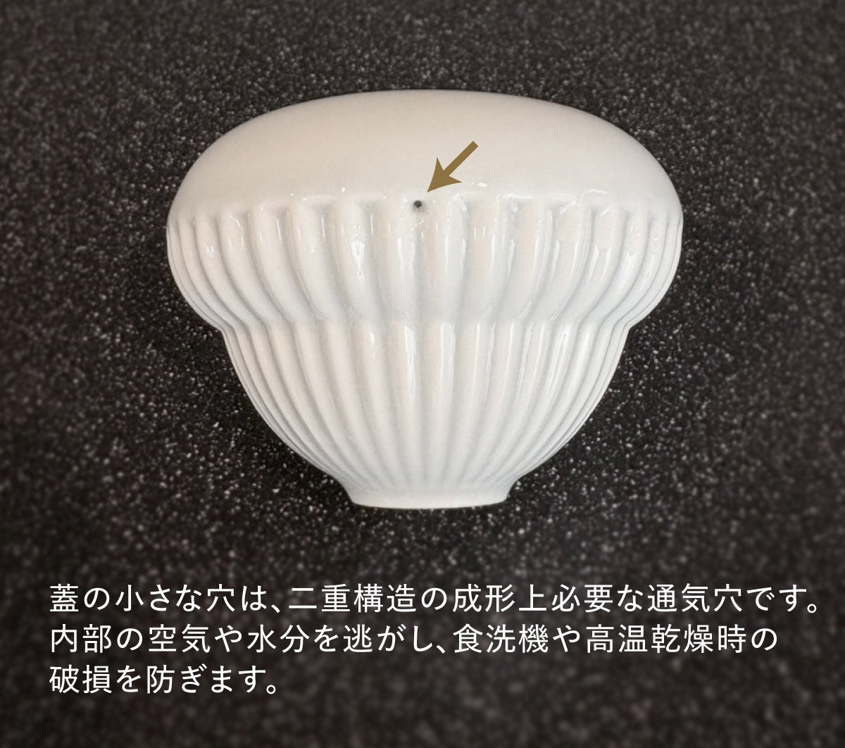 A. 蓋の小さな穴は、二重構造の成形上必要な通気穴です。内部の空気や水分を逃がし、食洗機での洗浄や高温乾燥時の破損を防ぎます。