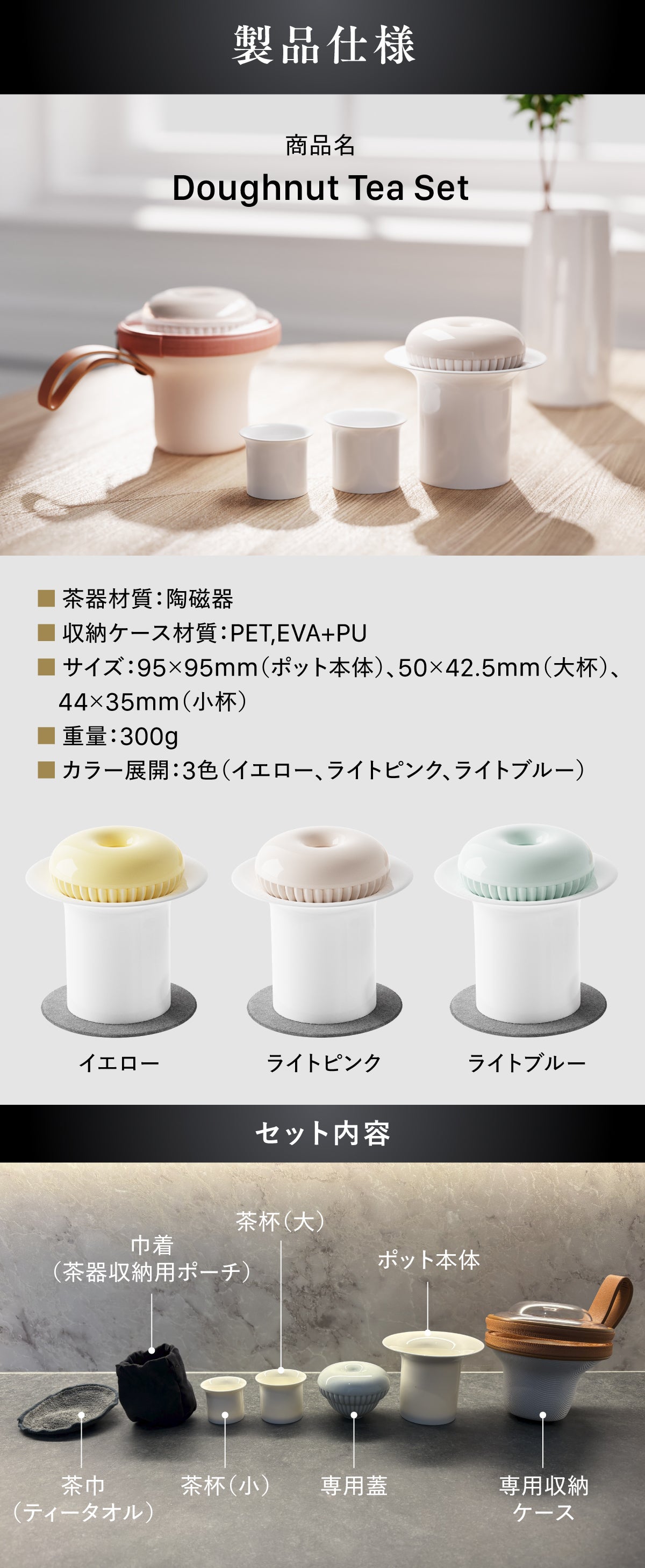 A. 本商品は、茶巾(ティータオル)、巾着(茶器収納用ポーチ)、茶杯(小)、茶杯(大)、専用蓋、ポット本体、専用収納ケース、が基本セットになります。デザイン性と使いやすさを兼ね備えた、コンパクトで実用的な構成です。