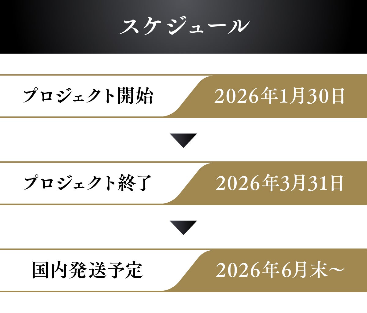 A.リターンページ記載の「お届け予定月(2026年6月末)」を目安に順次発送いたします。製造状況や輸送状況により前後する可能性がございますので、進捗状況は随時、CAMPFIRE(machi-ya)の活動報告にてご案内いたします。