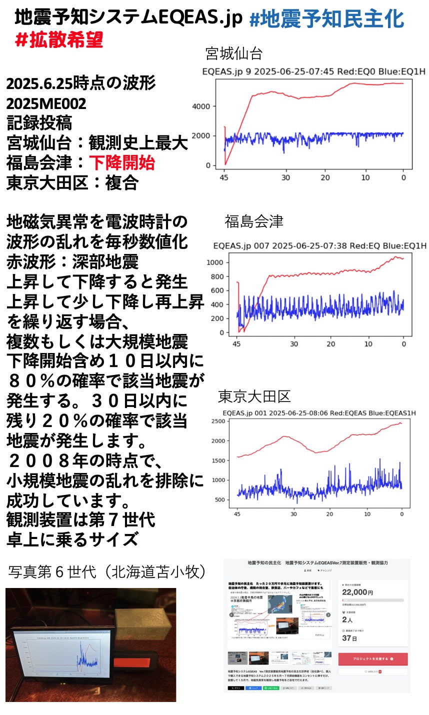 地震予知を2005年から、個人の趣味で開始、電波時計の地磁気異常を検出し数値化、波形の乱れ方によって、重み付けしています。予知アルゴリズムは2008年で完成(当時は5か所で観測、東京、神奈川、千葉、埼玉、仙台)し、1カ月数百回発生する地震から、震度3以上の地震が発生する前兆を波形で表す事に成功、法令の関係でFaceBookの友達やMLで予知を周知していました。2008年8月駿河湾地震以降、予知範囲の震度4以上の地震は全て的中し誤報は1回のみ。