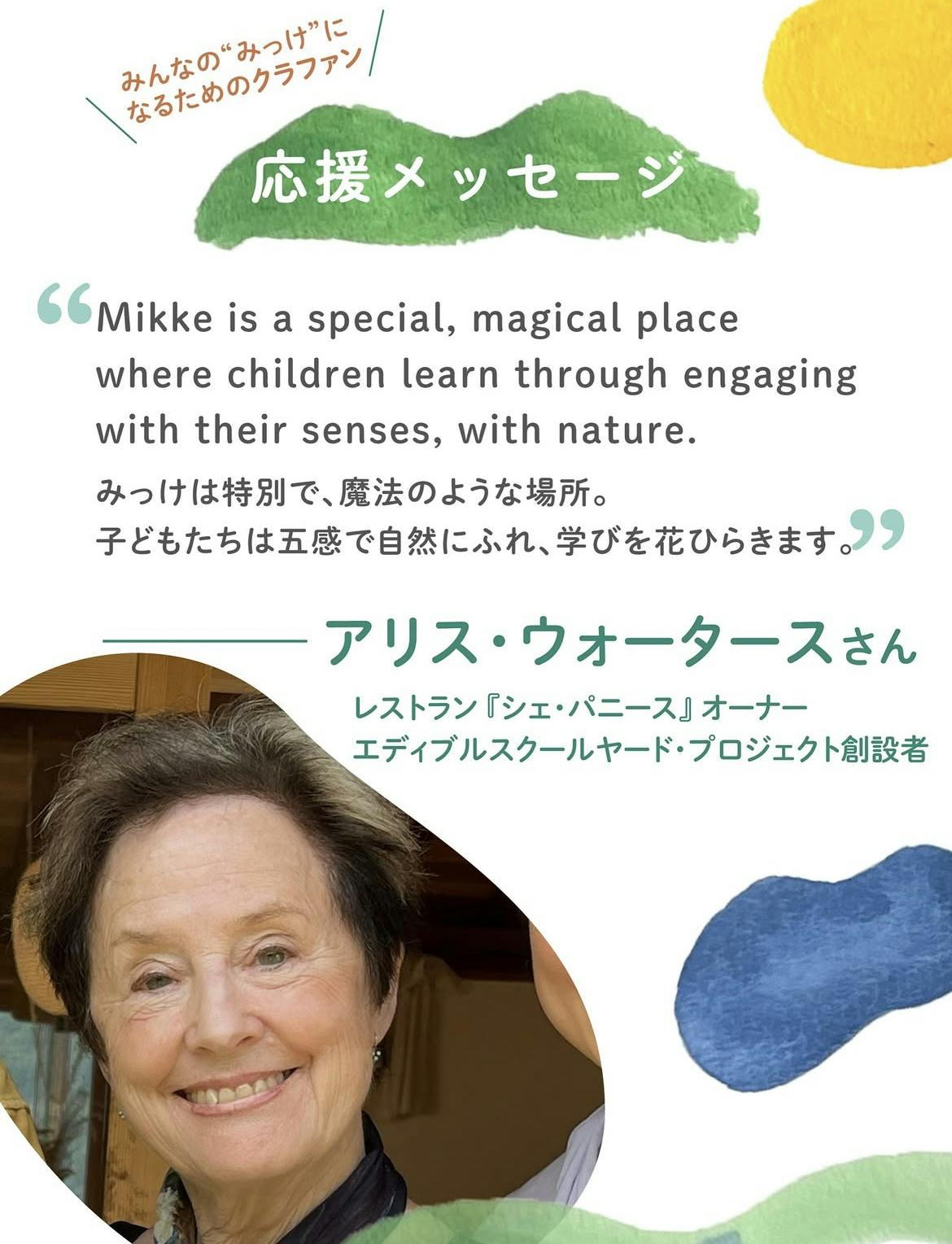 エディブルスクールヤード・プロジェクトの創設者のアリス・ウォータースさんに応援メッセージをいただきました。