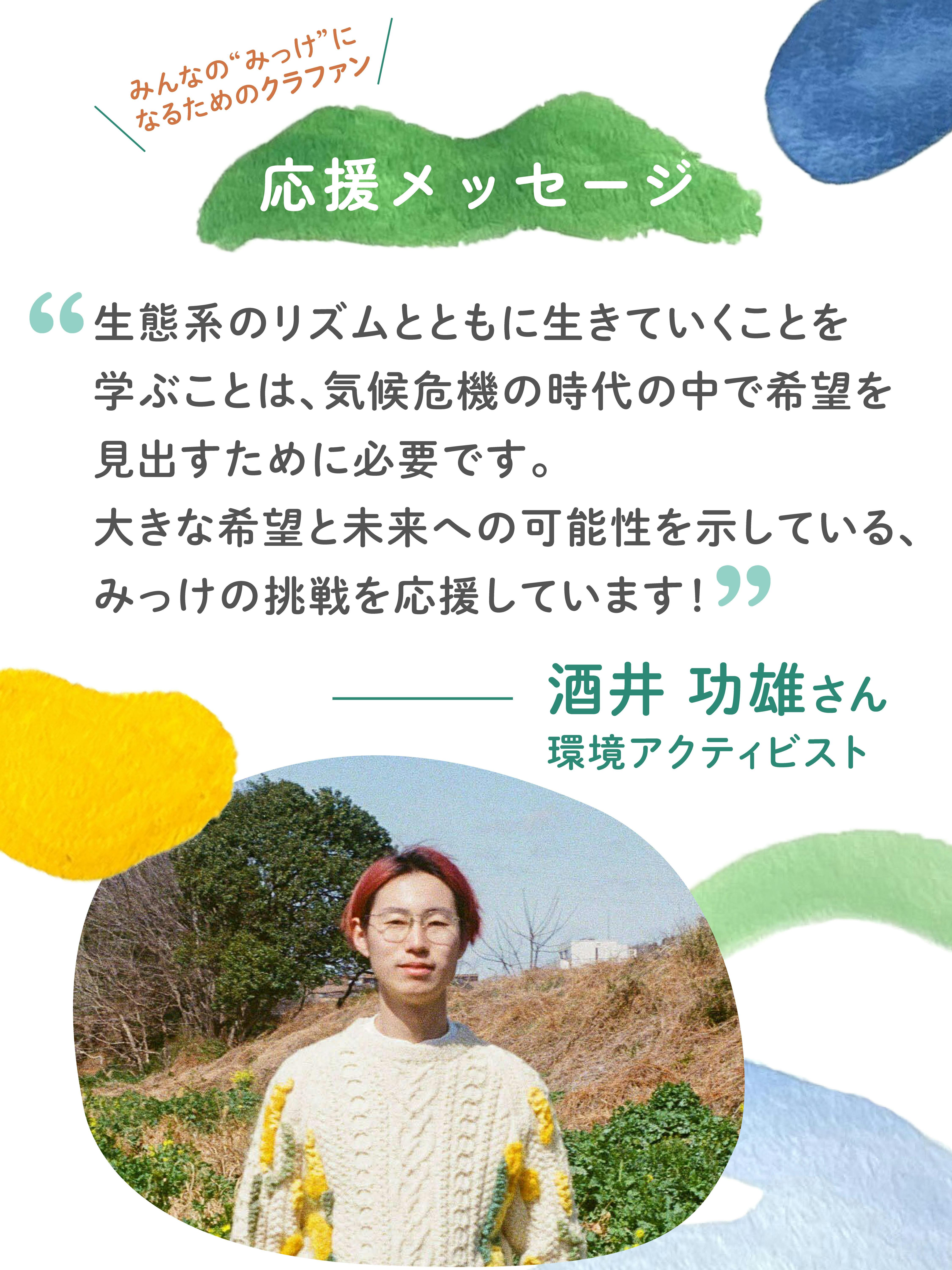 生態系のリズムとともに生きていくことを学ぶことは、気候危機の時代の中で希望を見出すために必要です。大きな希望と未来への可能性を示している、みっけの挑戦を応援しています!』