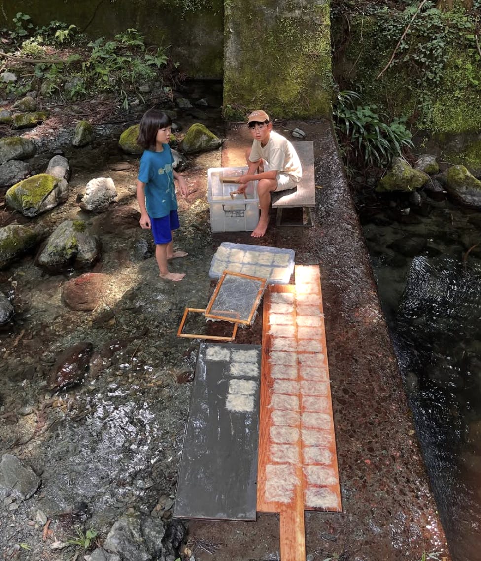 ◉まだ筍が竹になる前の5月のはじめ、若竹を収穫しました。それを腐らせ、繊維を砕いて紙漉きをし、ハガキを作りました。和紙と組み合わせ、ノートの形に製本し、大切な友人たちにプレゼント。今日は、終業式という名の送別会でもありました。1年半を共にした子、1週間体験留学に来た子、半年間みんなと遊んでくれた踊り子。みんな唯一無二で大切な存在。みんな来てくれてありがとう。