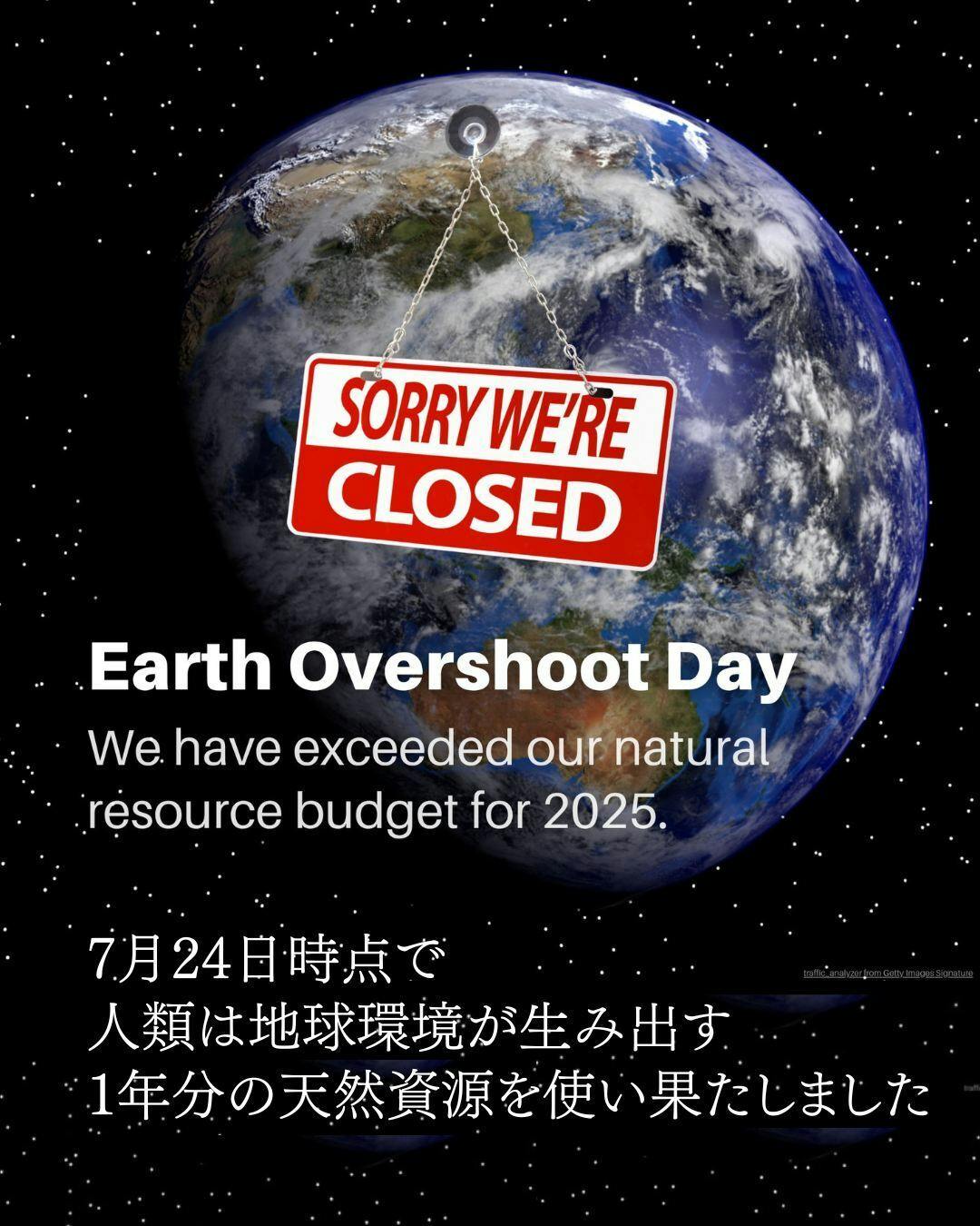 「7月24日の時点で人類は2025年分の再生可能な量を超える天然資源を使い果たしました。地球の自然システムは私たちの需要を維持できません。生産と消費のあり方を再考し持続可能な選択をすべき時です。 」