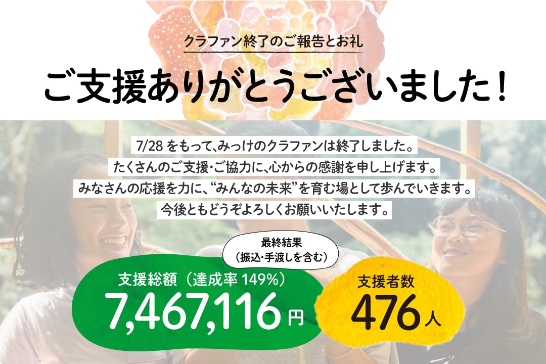 《追加支援方法》「クラファンに間に合わなかった」という方から多数お問い合わせいただいております。みっけのホームページから寄付することができます。https://www.mikkeforest.org/kihu