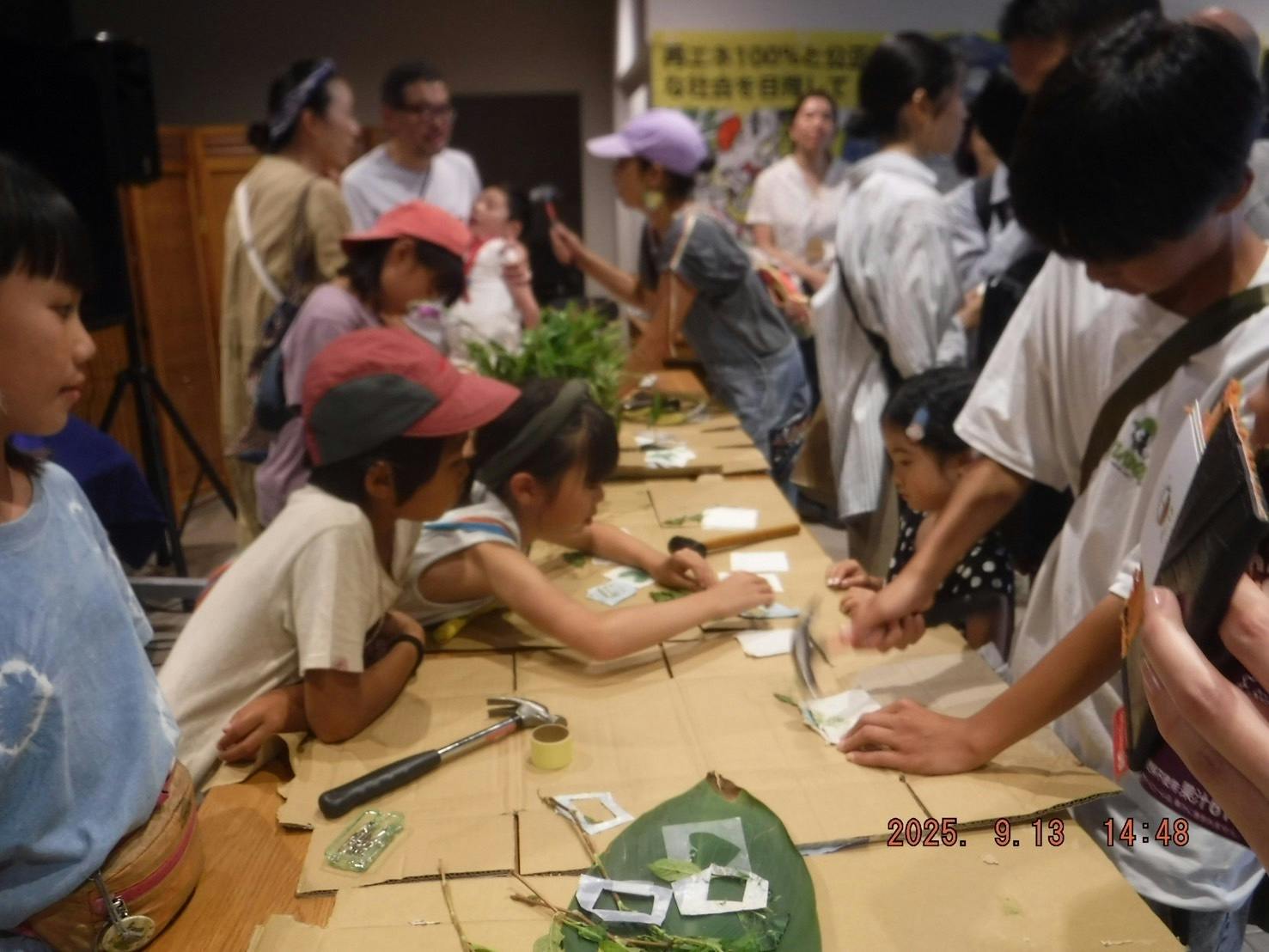出発前に朝子どもたちと収穫した無農薬の藍といらなくなった布でパッチ作りのワークショップを行いました。藍の花や葉を見たことない人も、たたき染をしたことない人も、大人も子どももみんなが参加して会場は賑やかになりました!