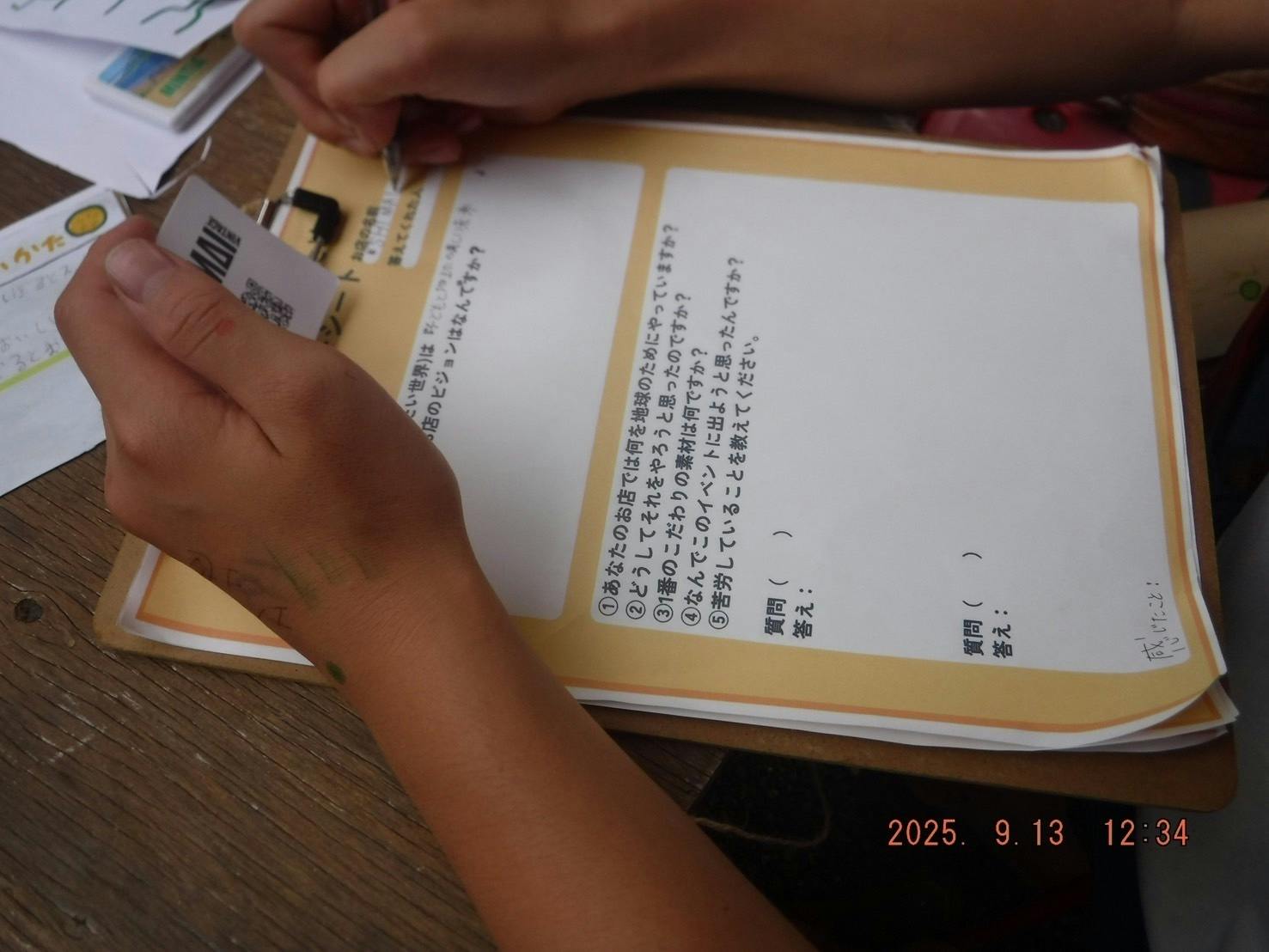 環境にやさしい取り組みを続けるお店の方々にインタビューしました。「靴下を売ることで地球をよくできるなんて驚いた」「子どもの未来を考えてプラスチックを減らしているお店がある」と、子どもたちの感想が飛び交いました。普段出会うことのない活動を知り、直接対話を通して新しい気づきを得る貴重な経験となりました。