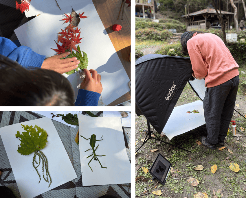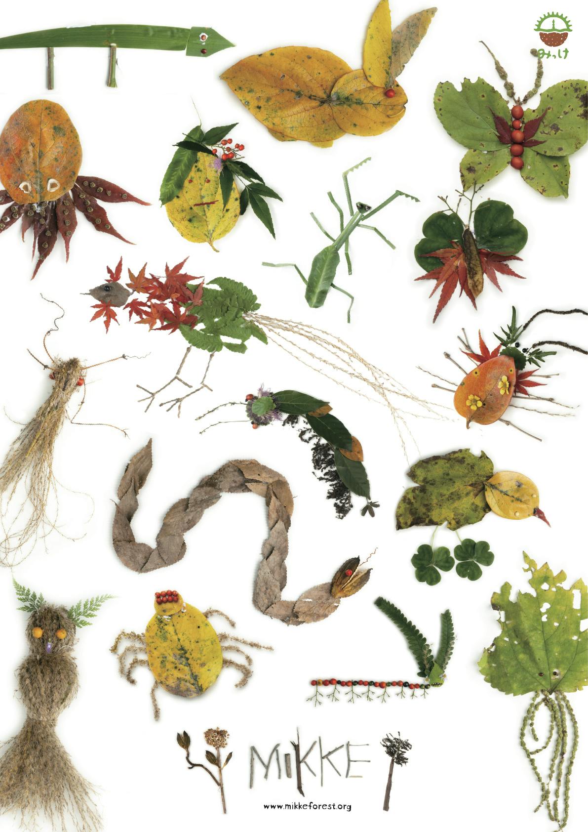 11月、紅葉が色づく秋の日に、みっけ周辺の植物を採取し、それぞれの形や色からインスピレーションを掻き立てられた子どもたちは、黙々と手を動かし始めました。一つ作っては撮影場所に持って撮影してもらい、その後も次々に生み出される植物の生き物。