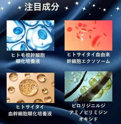 この製品は、化粧品カテゴリーの中でも高価格帯に位置づけられるプレミアムクラスの処方設計。なかでも、注目していただきたいのが毛根幹細胞培養液を3%という高濃度で贅沢に配合していること。再生医療の分野でも話題の成分を、日々のホームケアに取り入れるという発想は、まさに革新です。
