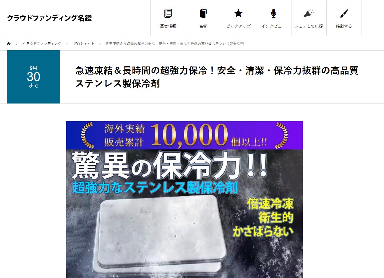 先日、クラウドファンディング名鑑で「急速凍結&長時間の超強力保冷!安全・清潔・保冷力抜群の高品質ステンレス製保冷剤」を紹介して頂きました。