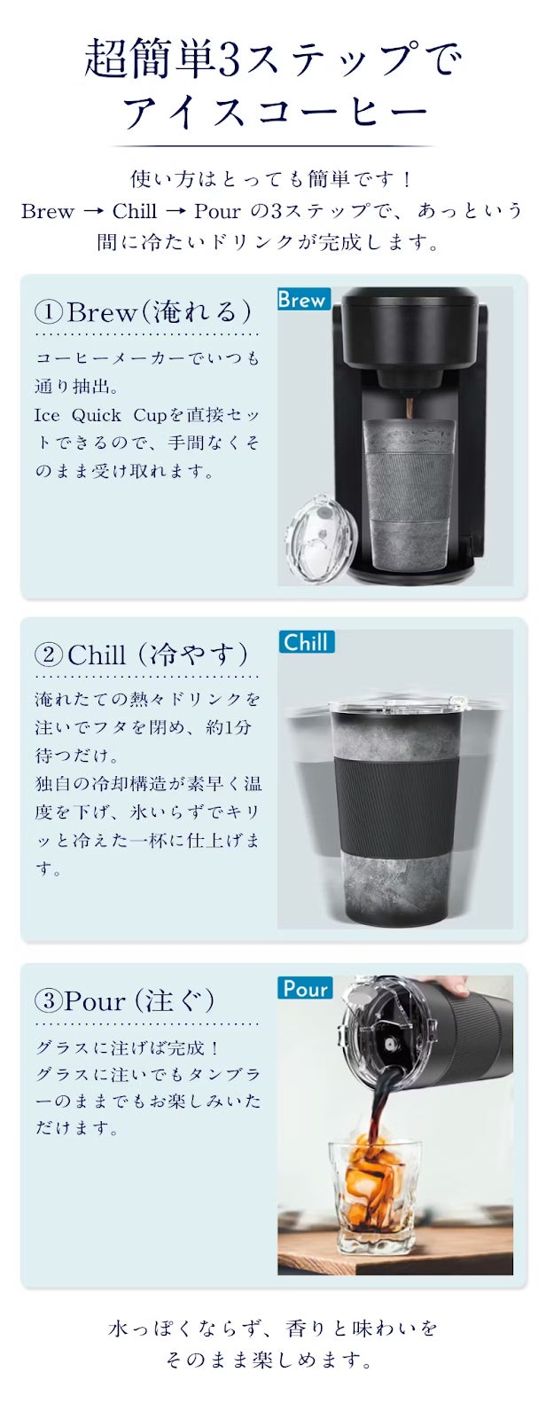 薄まらない美味しさが続く。90秒で香りとコクを引き出す瞬冷プレミアムタンブラー