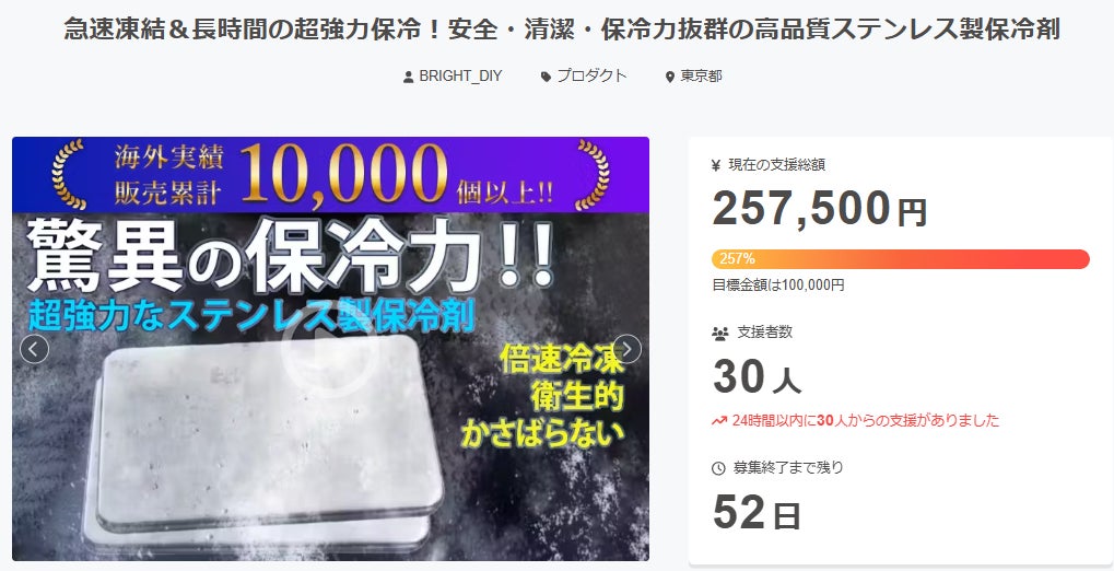この度は「急速凍結&長時間の超強力保冷!安全・清潔・保冷力抜群の高品質ステンレス製保冷剤」に支援頂き誠にありがとうございます!お陰様で、開始から20分経たずに10万円の目標金額を100%達成することができました。ご興味のある方、ぜひ支援お願い致します。https://camp-fire.jp/projects/856558/viewBrightチームは、当プロジェクトをもっと多くの方に知っていただきたいと考えております。よかったら、FacebookやTwitter等のSNSでのシェア・拡散をお願い致します。#brightdiyどうぞよろしくお願い致します。Brightチーム
