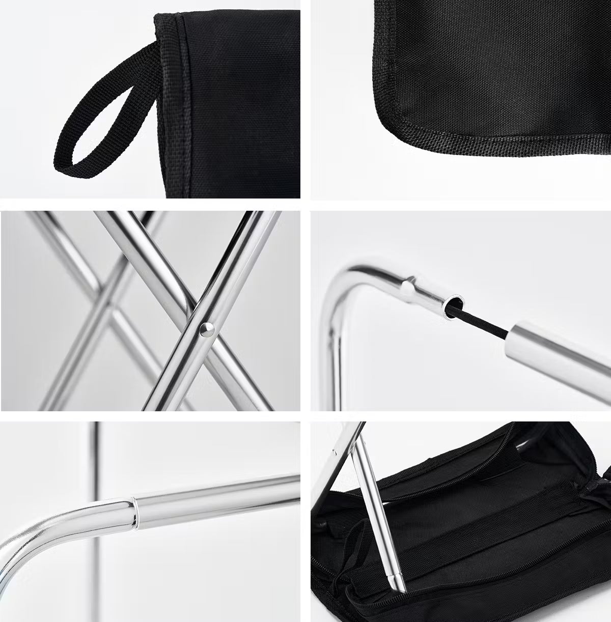 コンパクトな見た目に反して、クイックチェアはその耐久性と安定感も抜群です。アルミ合金製のフレームを使用しており、軽量でありながらしっかりとした強度を誇ります。脚部分はリベットで固定されており、耐荷重は約90kgまで対応。安定して座れるので、長時間座っていても快適です。