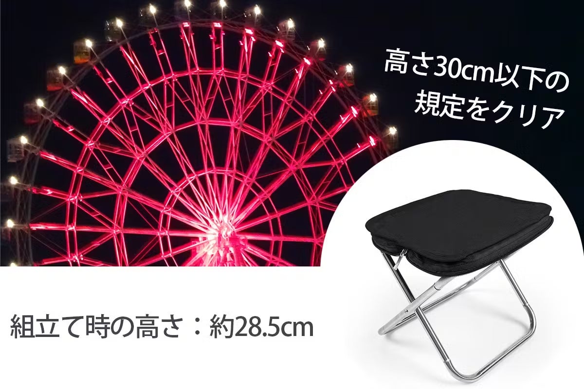 また、クイックチェアは座面の高さが約28.5cmに設計されており、この高さが使いやすさを大きく引き立てています。日本国内の遊園地やテーマパークでは、持ち込み可能な椅子のサイズに規定がありますが、このチェアはその基準をクリアしており、レジャー施設でも安心して使用できます。さらに、低めの座面はリラックスした姿勢でくつろげるだけでなく、子供や高齢者の方にも優しい設計になっています。